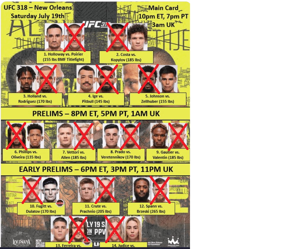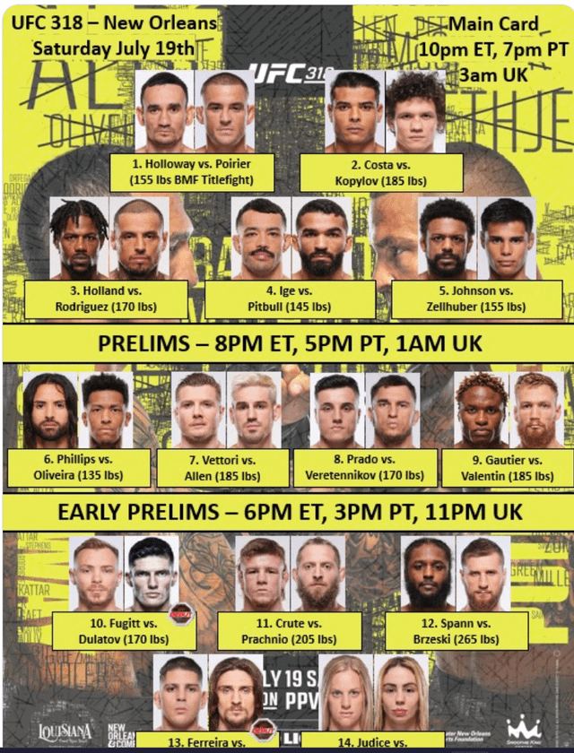 Бой топовых легковесов 20 июля возглавит турнир #UFC318 в Новом Орлеане.