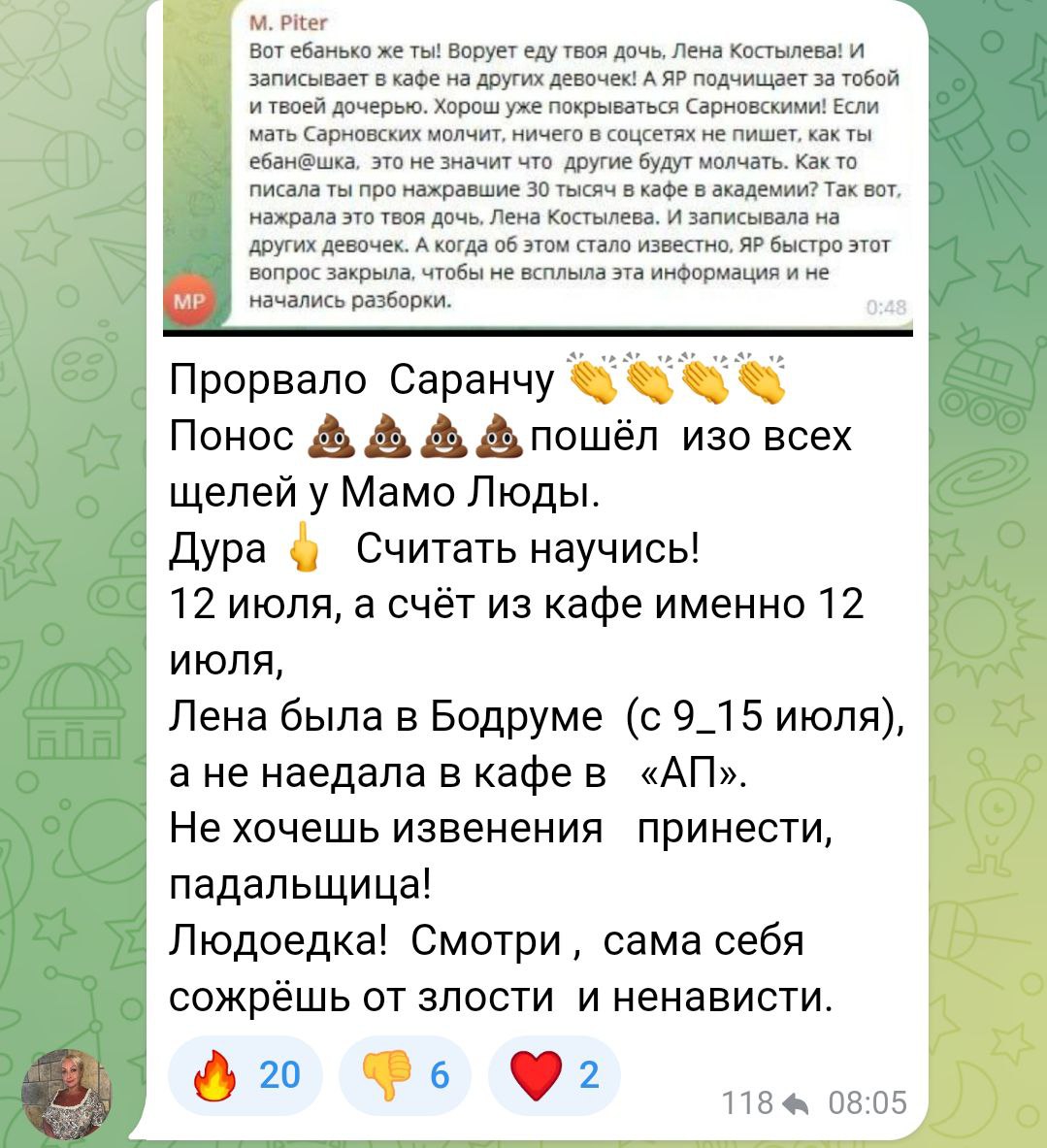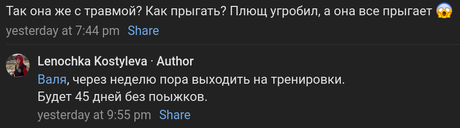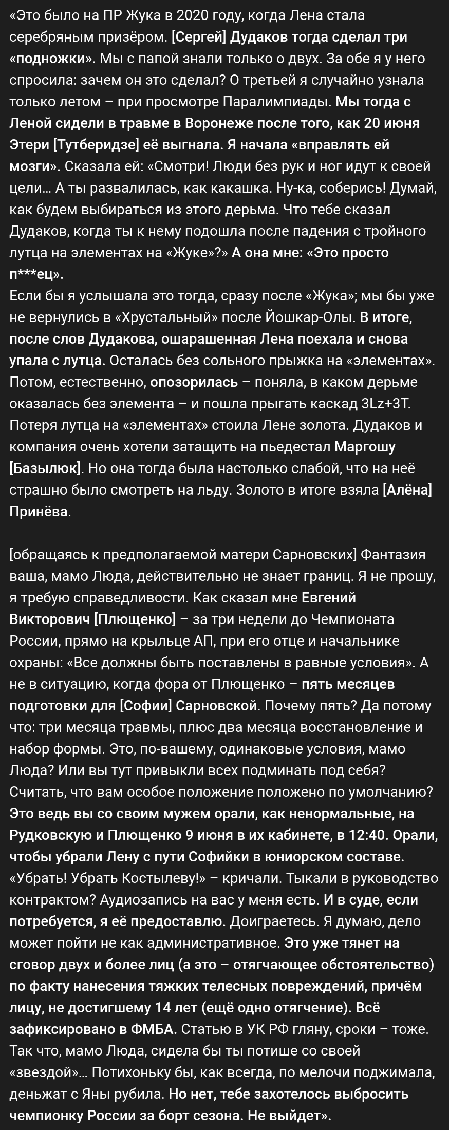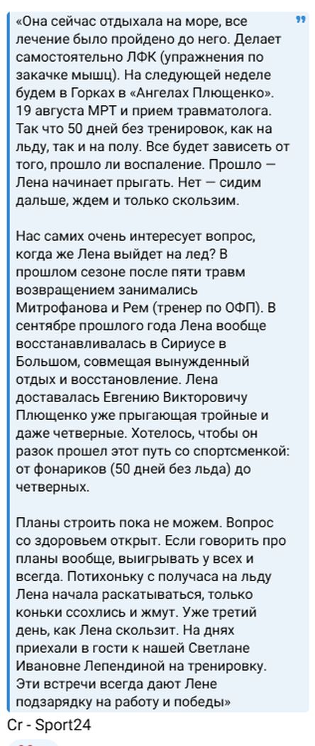 Сезон 2025-2026 "5 июня. Когда Лена не каталась и не прыгала с 13 мая, и только 2 июня, спустя 20 дней, впервые вышла на лёд - Плющенко тут же погнал её на тройные прыжки. Добить её сустав на третий день после выхода на лёд? Да, как только Лена 30 июня пришла после первой тренировки и сказала мне, что не может прыгать, по причине боли. И я о6 этом передала через, администратора Плющенко. Лена может только скользить на второй тренировке. Жалюзи на окнах в кафе, сразу поднялись. Скрывать больше нечего. Дело сделано. Я зафиксировала факт открытия жалюзей и всей коблы Сарновских восседающий у экрана на лёд."