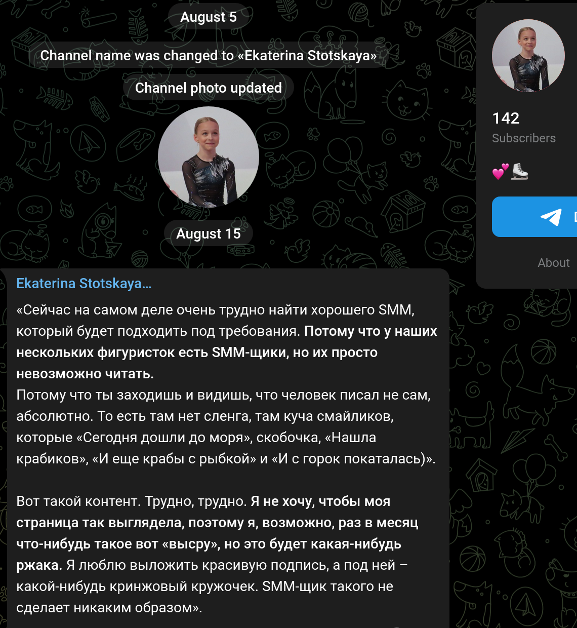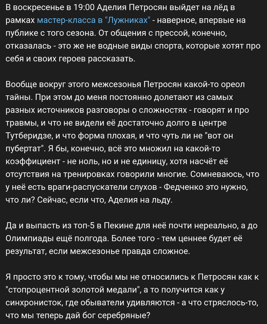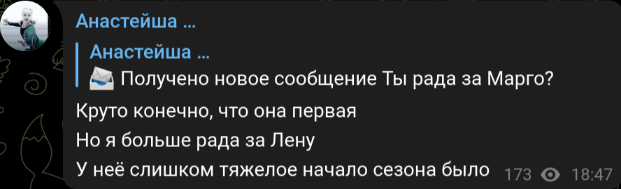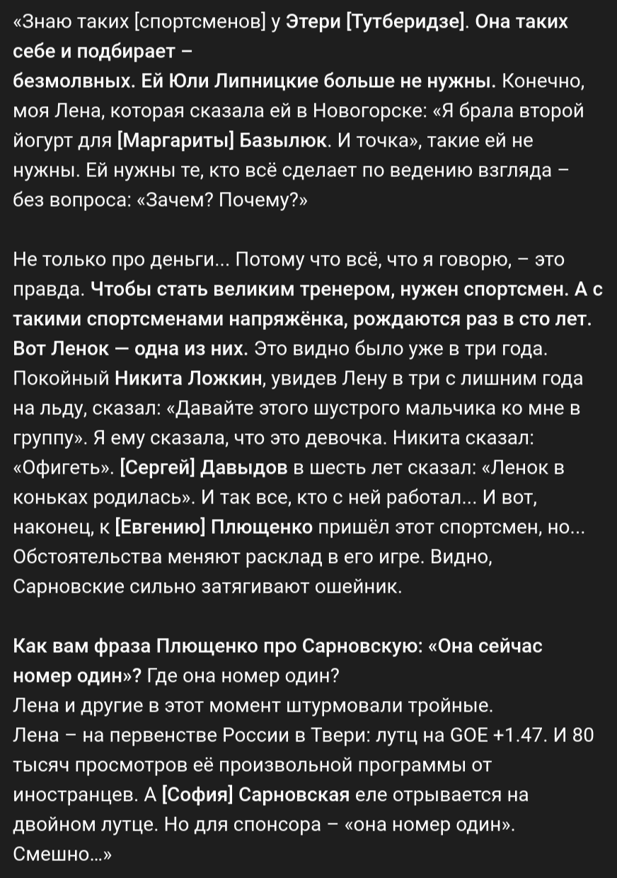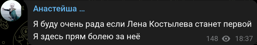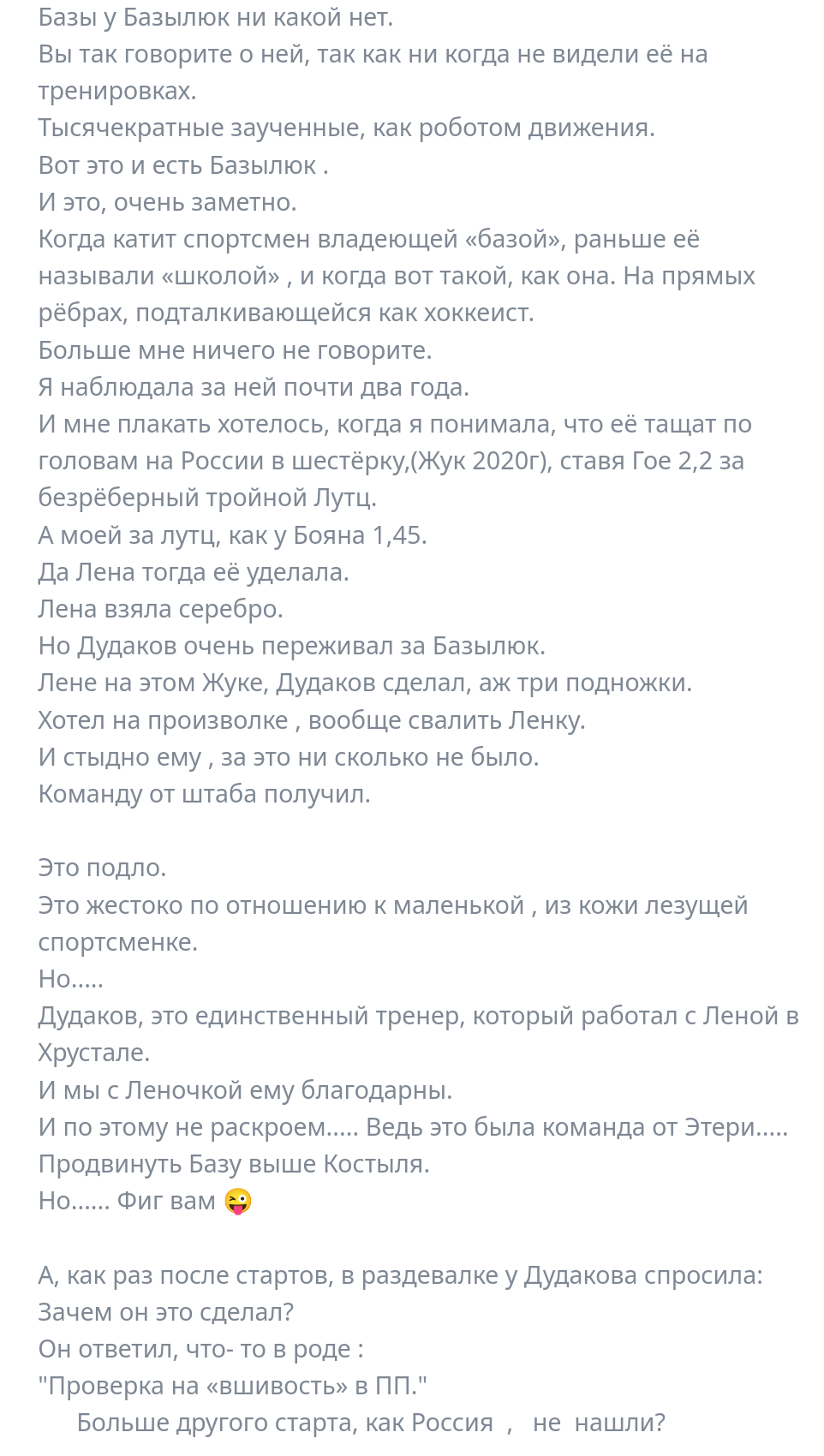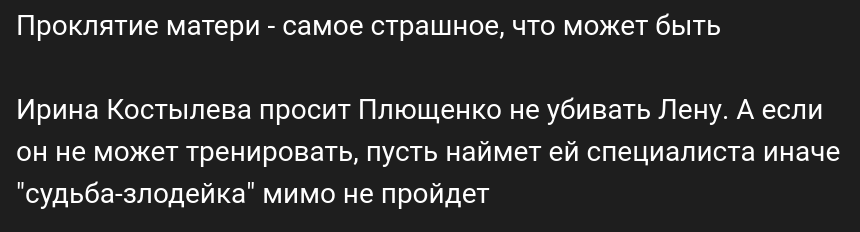Сезон 2024-2025 "Я подумала , глядя из кафе на лëд числа 4-5 октября: На хуя за неделю, до первого этапа Гран-при - 11 октября учить четверной Лутц Лене? Всë межсезонье, даже подводящих не давал. А тут аж сам на лëд вышел. На тренера -дурака , вроде не похож. Точно хочет в травму вогнать. Это самый худший, в моральном смысле год. Год, сплошных восстановлений контента с нуля. Пять травм и два восстановления по болезни. Семь раз с нуля, буквально максимум неделя до старта, который ещё она и выигрывала у лучших. "