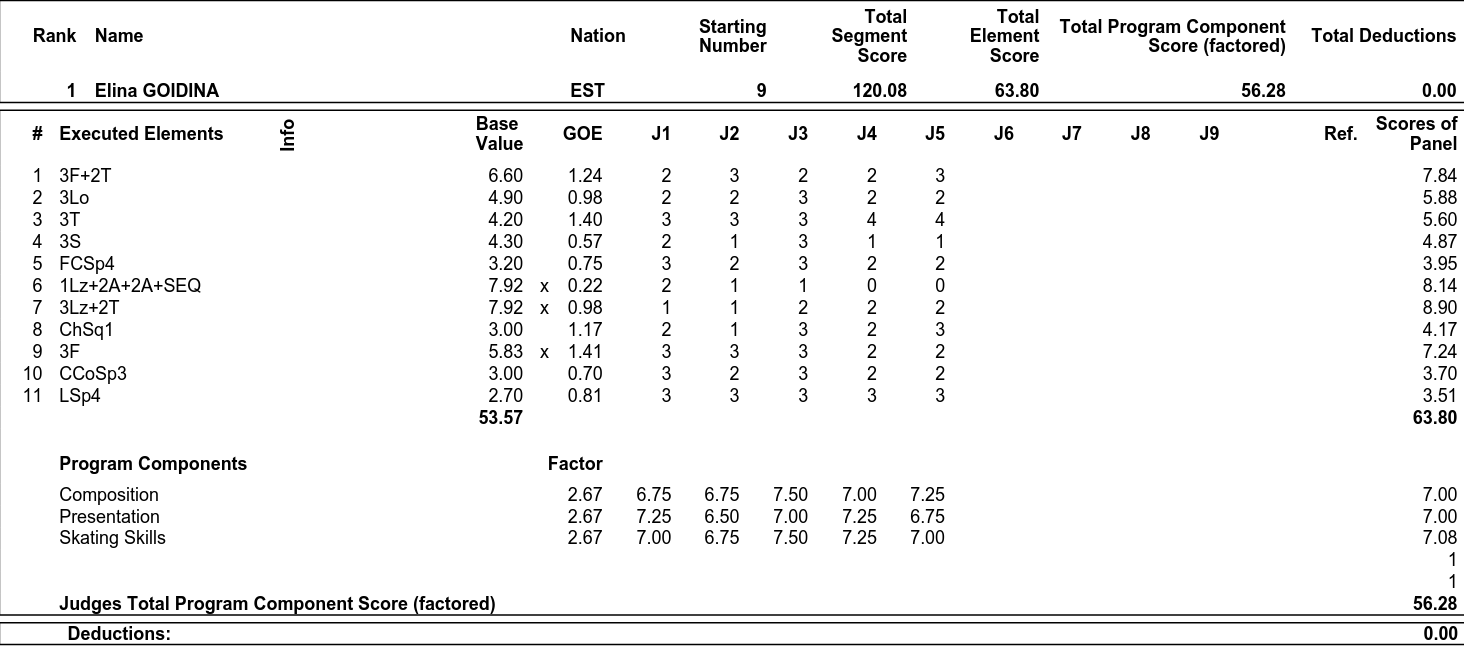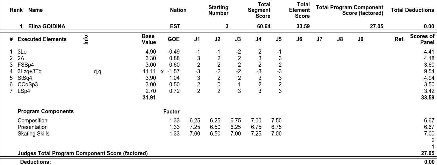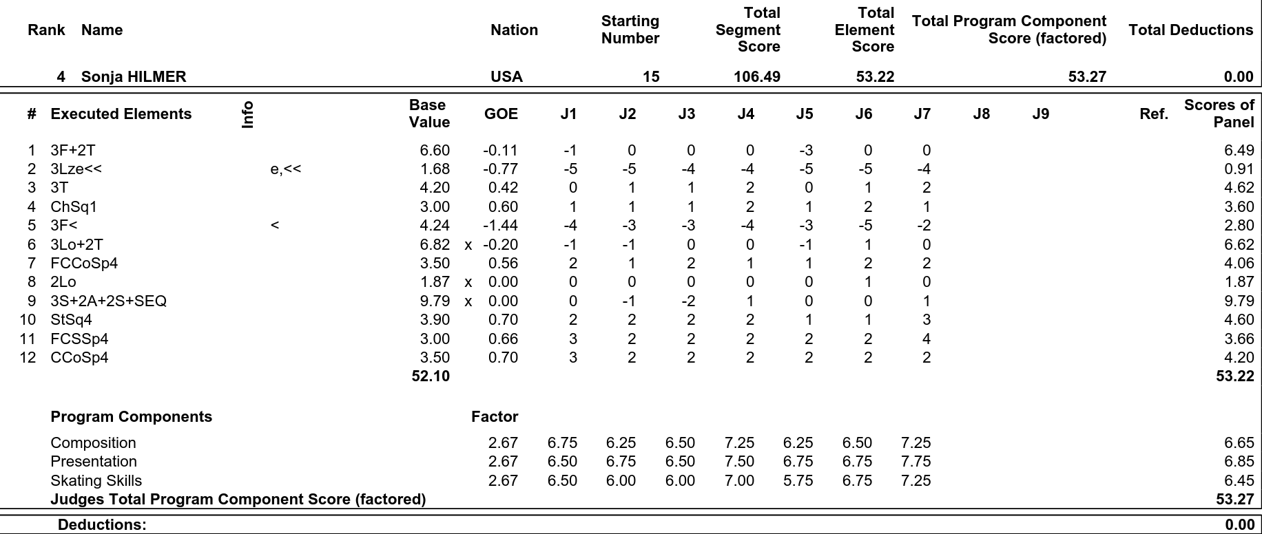 Sonja HILMER, USA 3f<?2t как-то не очень 3z<<? или это флип? 3t chsq1 гидроблейд 3f ??? на зубец в присядку 3r<2t 2r 3s ho 2a+seq +1a (каскад) в противоположную сторону визг комбинированное тоже в обе стороны визг