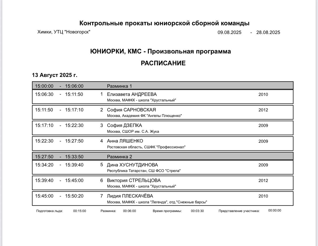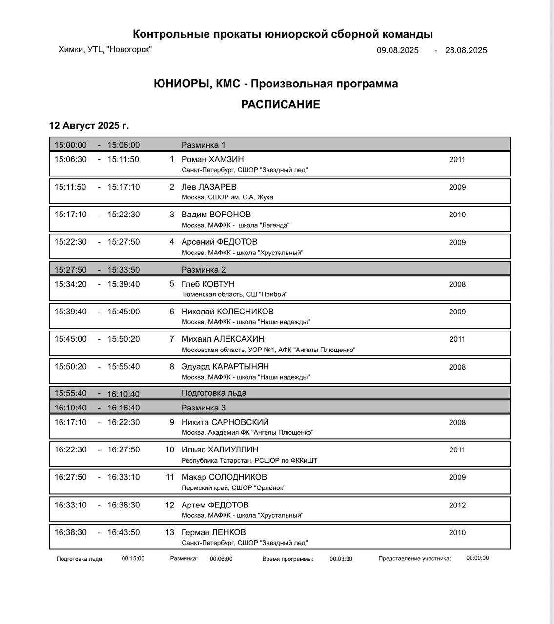 12 августа 15:00-16:45 – Юноши произвольная программа 17:00-18:45 – Девушки короткая программа По окончании разбор коротких программ со специалистами (девушки)