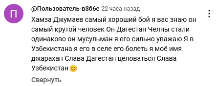 «Это огромный комплимент, особенно от Хамзата. Я большой его фанат. Я не думаю, что у него есть какая-то причина расхваливать меня или проявлять скромность – ему это совершенно не обязательно. Тяжеловесы его боятся, и тот факт, что он испытывает ко мне такое уважение, для меня действительно много значит. Его щедрая похвала многое говорит о его характере, о его скромности. Так что я очень благодарен ему и польщён», – сказал американец в интервью Red Corner MMA.