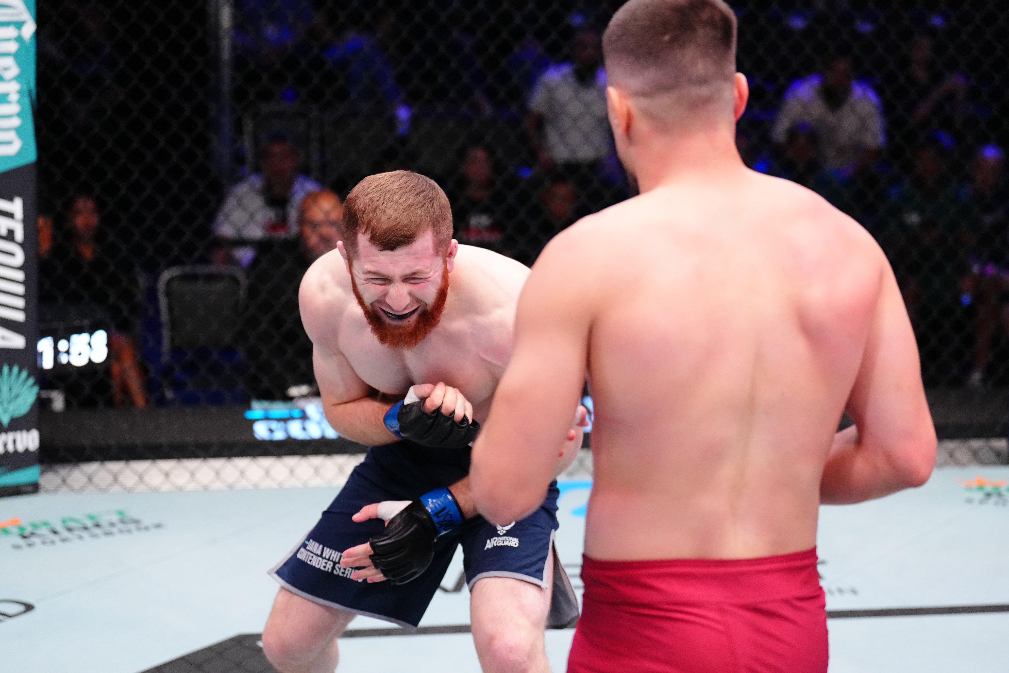Нахуй смотреть это? Всё же очевидно. Первый раунд, проход в трусы, поваляется так какое время, потом найдет положение для удушающего и всё. В пять минут уложится