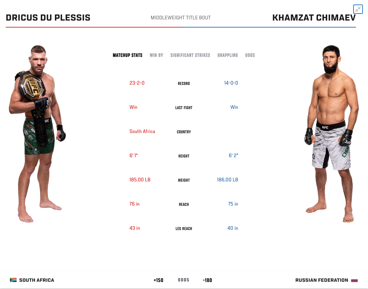 >>3233533 а, у меня там возврат по ним. уже несколько раз писал - используй stake - это идеальная, топ1 платформа для ufc (без учета каких-нибудь азиатских полузакрытых про которые 99,9% никогда не слышали даже). в ближайшее время хочу статистику подбить и заодно оценить количество сплитов за год, уверен, там цифры существенные, чтобы их игнорировать, может 5%, то есть маржа. плюсом промки на номерные турниры, по идее на победу чимаеча в первом раунде х2 дадут просто так. плюсом прямо на сайте бесплатные официальные трансляции.