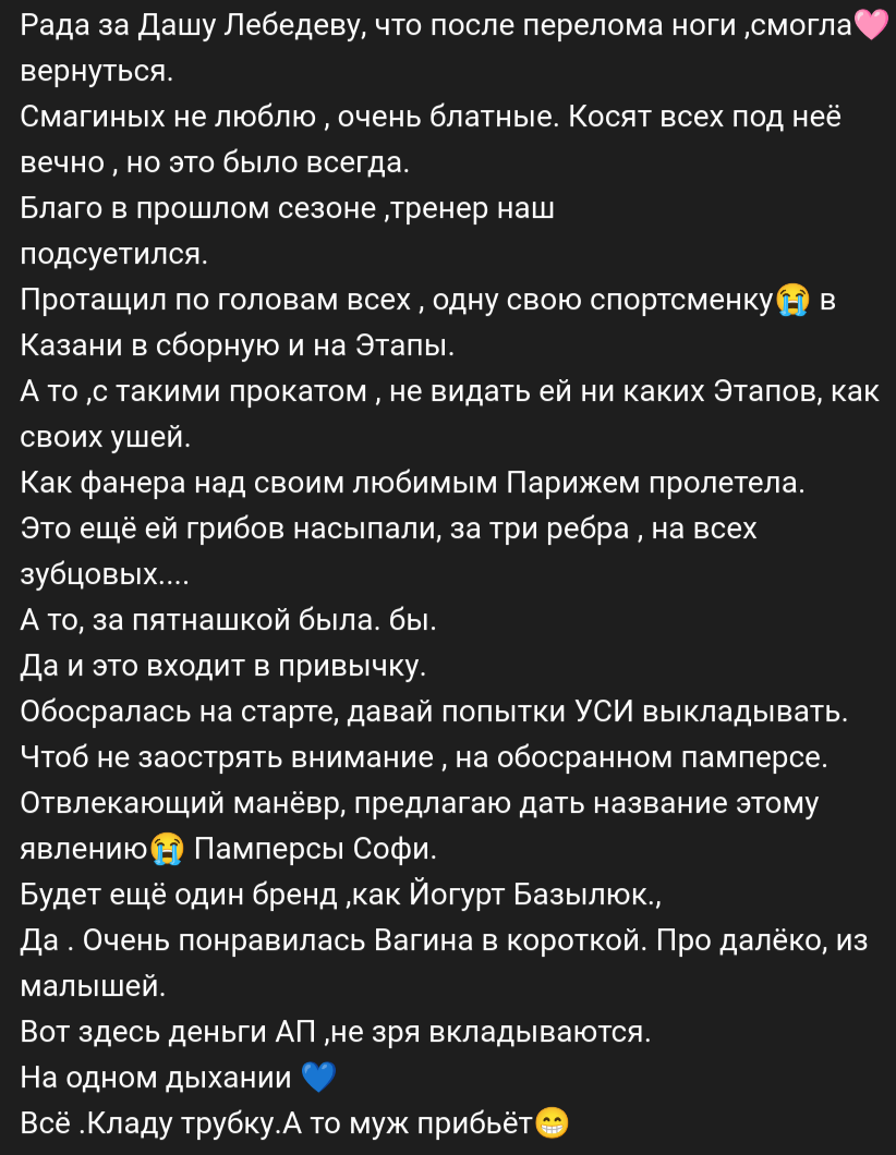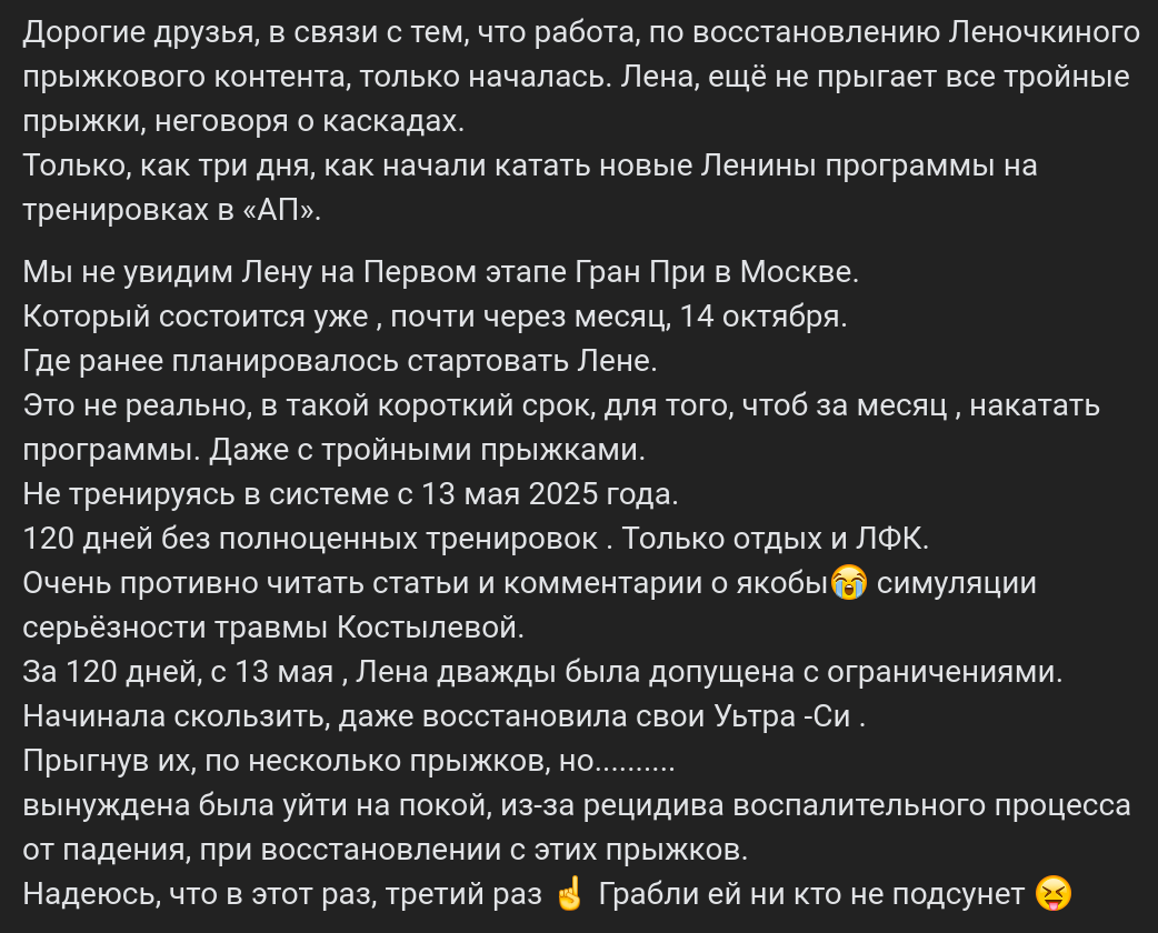 Предыдущий: >>3235188 (OP) Ну и какого хрена, сколько можно просить не ставить всяких Костылевых на ОП-пик? Ирину Алексеевну забанили в тг. Андреева выпустила влог с готовкой. Dmytro Dmytrenko разочаровался в украинском фк и тренирует какую-то Максиму из EVH (Энгельсы Плющенко). Германию на этапе ЮГП будет представлять некая одиночница Diana Alexandra ZIESECKE из Москвы, бывшая ученица Федченко и Черкасовой. Опять роем себе яму, на которой сидим. Бранденбург ушла к Розе, сравним с результатами у Этерички. Ткачман тренируется на катке Юлии Заутер. У половины украинок хобби "акробатика". Этеричка с Дудачком исчезли из списка бывших тренеров Бранденбург. Хейтеры, указавшие телефон Костылева Валерия, мужа Ирины Костылевой, зашифровывают в фотографиях Софии какие-то грязные послания. Вполне ожидаемо, что одна и та же фотография на канале Сарновской, и на фейковом канале, созданном завистниками (куда она загружена всего на 35 секунд позже) различаются по содержанию. Эмилия Нахаева перешла в августе в группу Юлии Липницкой. У Дзепки уже в фанатах модельеры с мировым именем. В семье Плющенко и Рудковской скоро ожидается пополнение. Мария Казакова встала в пару с Владиславом Касинским. Злата Саприна пригласила Kitty на свой день рождения. Дина Хуснутдинова пришла на просмотр в группу Этери Тутберидзе. У Любовки в позвоночнике расшаталась конструкция, установленная ранее в рамках предыдущей операции на спину. Стрельцова с годами станет похожа на актрису Светлану Смирнову. В Хрусталь тянет Хуснутдиновых, Щербаковых и Парсеговых, уже по несколько штук. Сейчас, правда, времена щербаковых/хуснутдиновых прошли, там топов тупо собирают. Федерация Санкт-Петербурга сделала рейтинг фигуристок. Нерсесян лишь третья, должны переделать рейтинг. Трусова продала коньки. another PINK FLOYED crap program. У Спрутика торчит косточка. Умер спортивный врач Виктор Аниканов. Тотальное доминирование эстонского фк в лице Крисы и Крысы. Финны выращивают свою Йозефину. Румын писал, что фракийцы - балты; хотя есть теория, что они родственны фригийцам и армянам. Объясняющая, почему у Фомченковой и Пашиняна похожие имена. Другое объяснение придумать сложно. Аргентинского тренера Рыбникова, похоже, не пустили в Латвию. Пермских камалдиновы уже не интересуют. Зажрались. anyone watchy-watchy rythm gymnastic WORLDS? with hyper-nyashka? Ковязину совсем засушили. Ирина Костылева вышла на связь с аккаунта мужа. Слухи подтвердились, Мариничева ушла в Барсы. HUH не стала обниматься с Дибберн. Какой-то Ионафан Елизарян выиграл золото. Армянское доминирование на турецкой земле. Бакушева участвовала в том самом Ice Star, с которого сняли Петрову (за то, что она выступала за Армению без разрешения федры). Самое идиотское, что до этого именно Фартушину выбрали для обучающего ролика на тему "Как снимать мерки с фигуриста". Миланка Ромашова страдает в Москве без Хуенгра. Бутазов рыгнул. Степченко диагностировали ПТСР. Ковалькова - это та самая трудноотоличимая от Гэмбилл тренерша. Отличие в том, что у Гэмбилл кладбище больше. Каревы в основном известны как тренеры прыгающих фигуристок (Графова, Гоголева, Шмелева) и пар. Д.Дрожжина из Буревестника СПб, одногруппница дочки Быстрова, тренеры Меньшов и Агеева. Слуцкая из Мытищ, одногруппница Майи Градусовой, группа Семишиной. Шепталина - одногруппница Виктории Морозовой (той самой) и Алисы Поляковой, группа Щеве