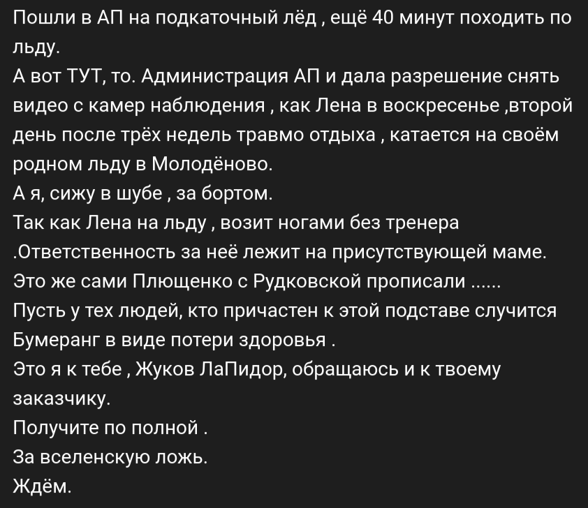 >Во время одной из прогулок на свежем воздухе по территории АП меня встретил Плющенко и поинтересовался как проходят тренировки, на что я ему соврал что "Пока спокойно восстанавливаемся, не форсируем, слышим спортсмена. Никуда не бежим, никому ничего не доказываем." Он меня похвалил, сказал - "Молодец, вот тебе 15000 рублей" и ушёл. Я стал обдумывать план как бы улизнуть оттуда под благовидным предлогом, пока всё не раскрылось