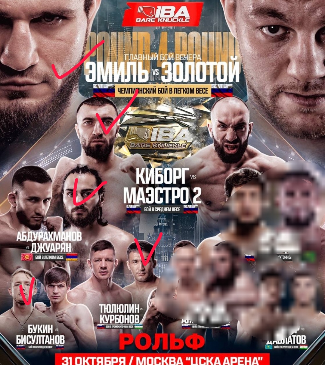 >>3255023 Фара - Странник. Победа Фары нокаутом. Внезапно. Байра - Раха. Победа Рахи по очкам. Юсупов - Пулемётчик. Победа Юсупова ввиду отказа угла Пулемётчика или многочисленных падений. Никулин - Кулмаганбетов. Победа Кулмаганбетова досрочно после нескольких ноедаунов