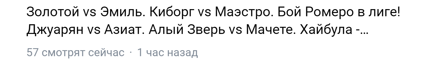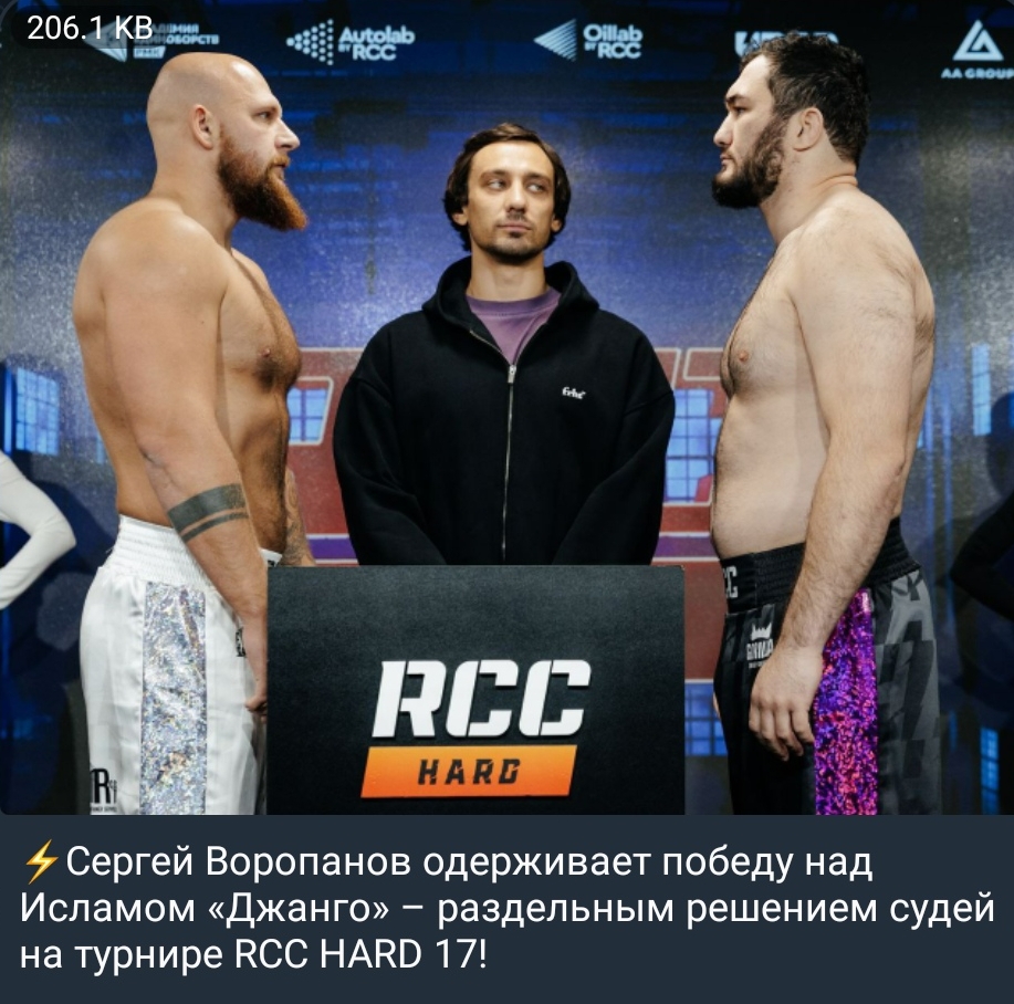 >>3243026 Тарабрин - Алый зверь. Победа Алого зверя по очкам. Букин - Бисултанов. Победа Бисултанова по очкам. Мусалов - Мачадо. Победа Мусалова нокаутом. Классика бразильских мешков. Абдурахманов - Джуарян. Победа Абдурахманова по очкам. Спорное решение. Киборг - Маэстро. Победа Киборга по очкам. Экшен. Отвёрнутые камеры. Эмиль - Золотой. Победа Золотого по очкам.
