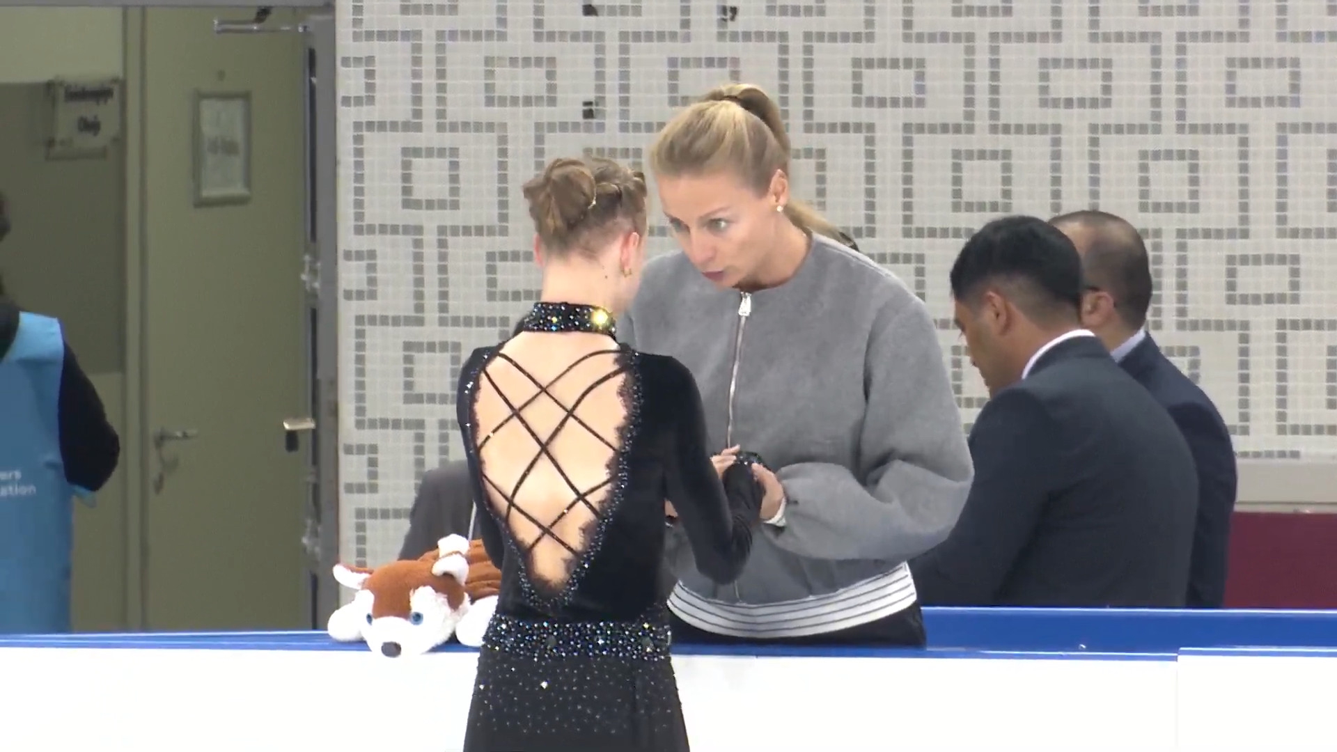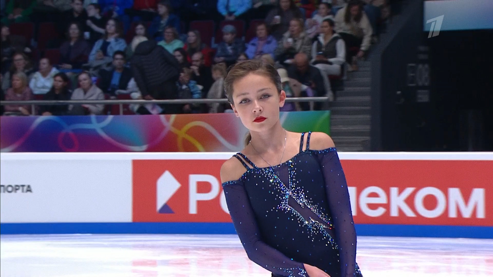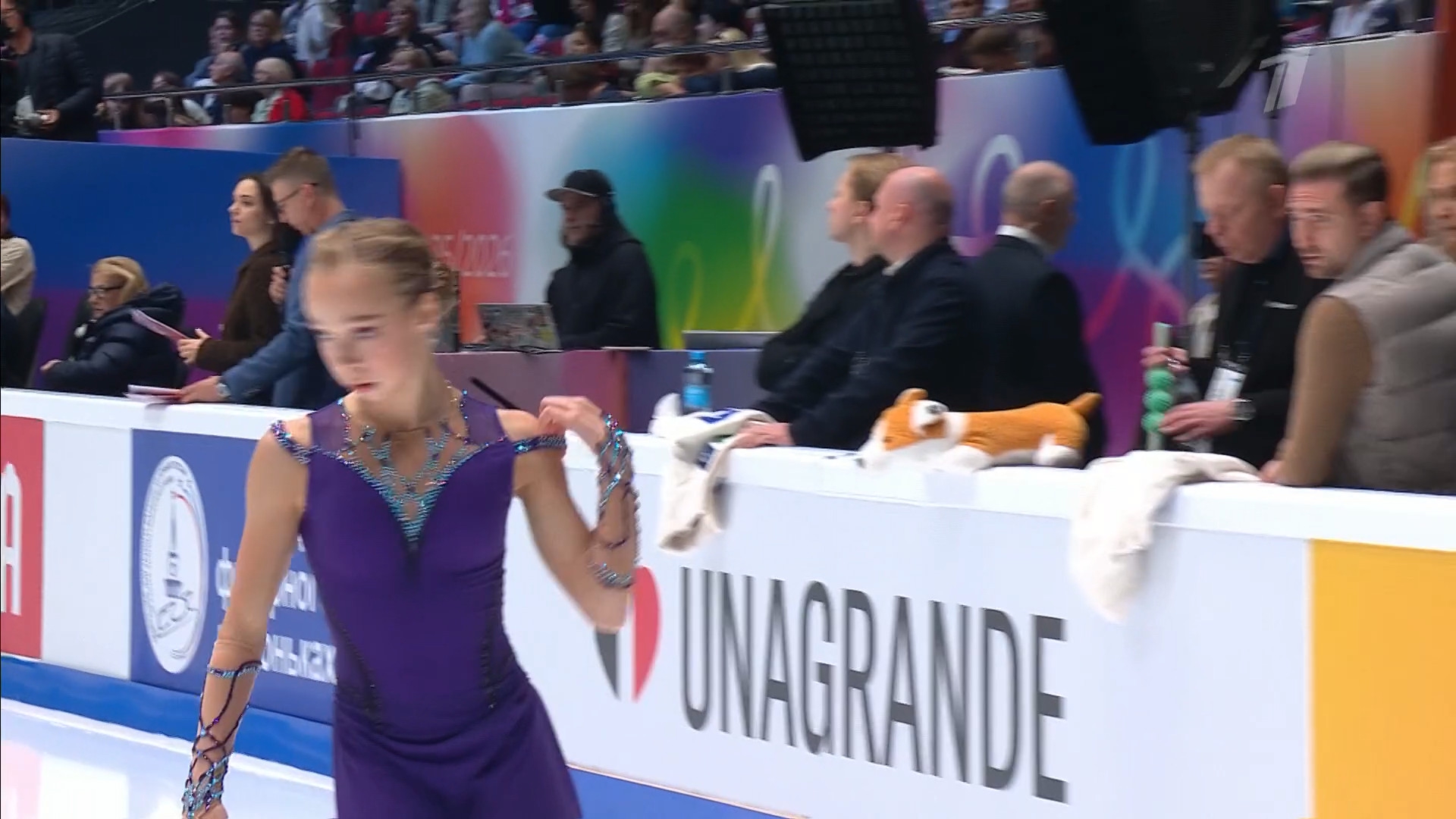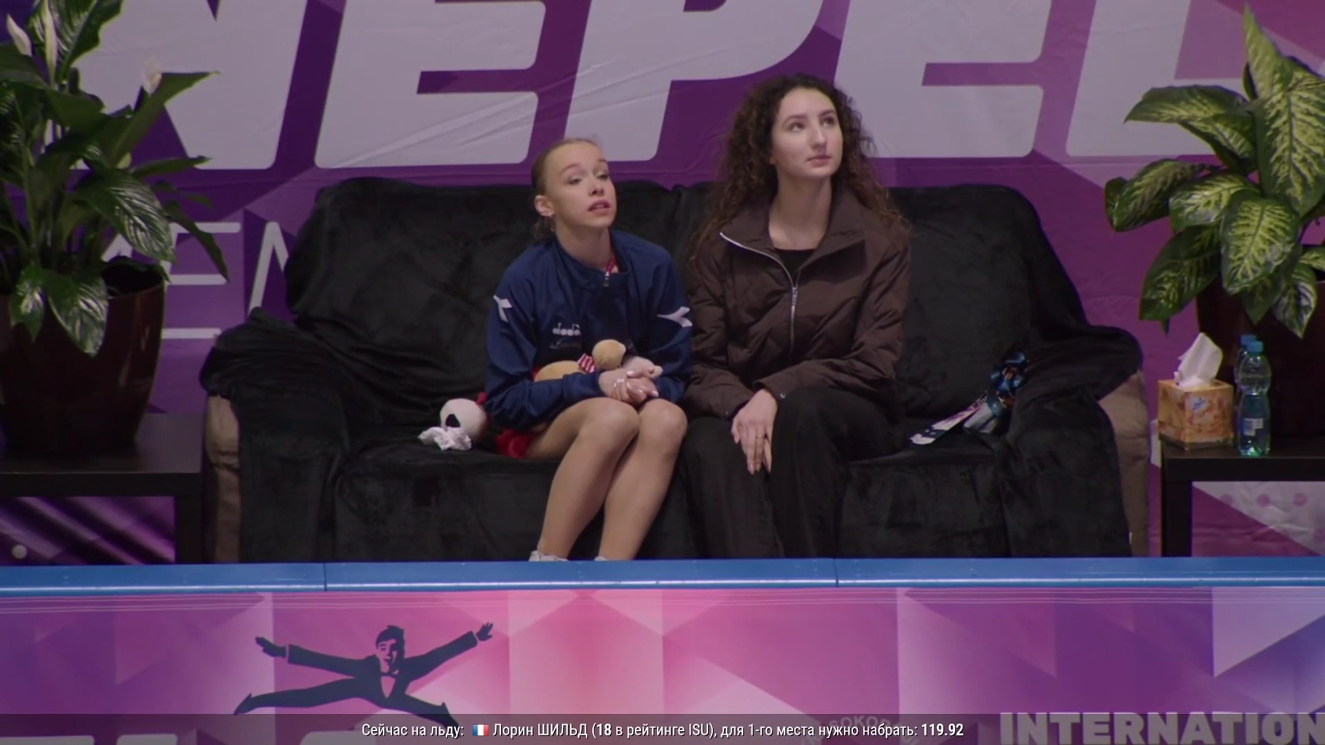 Одна няшка еле откатала свою пп второй раз за день, после чего высунула язык. Вторая няшка выскочила на лёд, ей закричали "куда???!!!" чем рассмешили няшку с микрофоном.