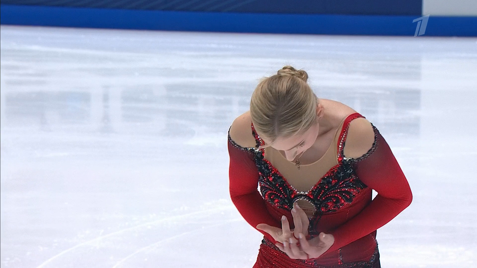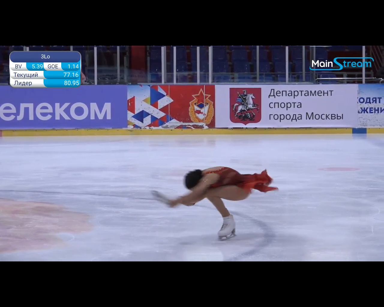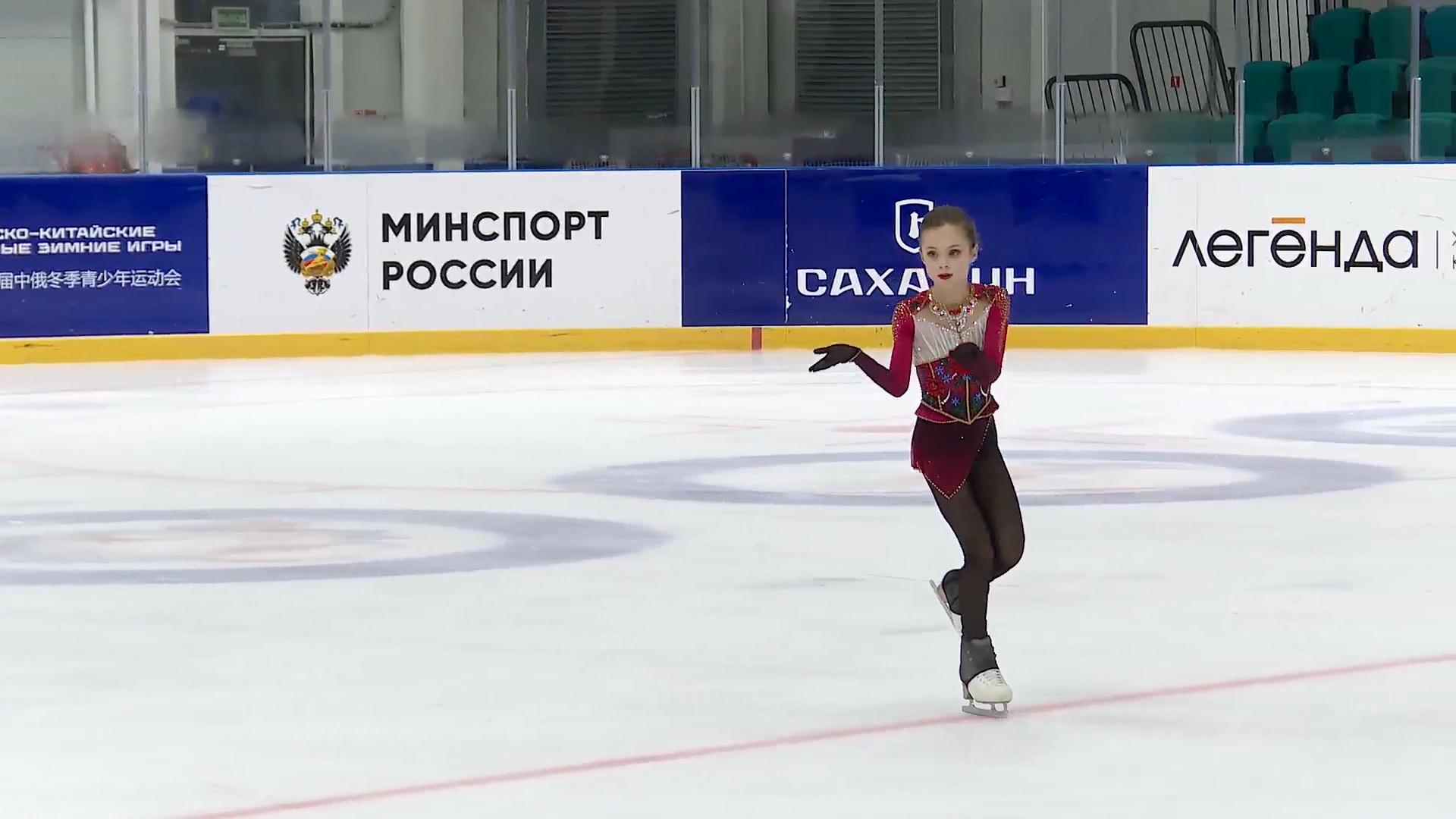 Алёна Витальевна Пяткина, СШ ОГАУ "Кристалл", Южно-Сахалинск в красном сарафане выдыхает у борта перед стартом 3r русская-народная дорожка 3sq2t танцует на зубчиках 2a fall с бести