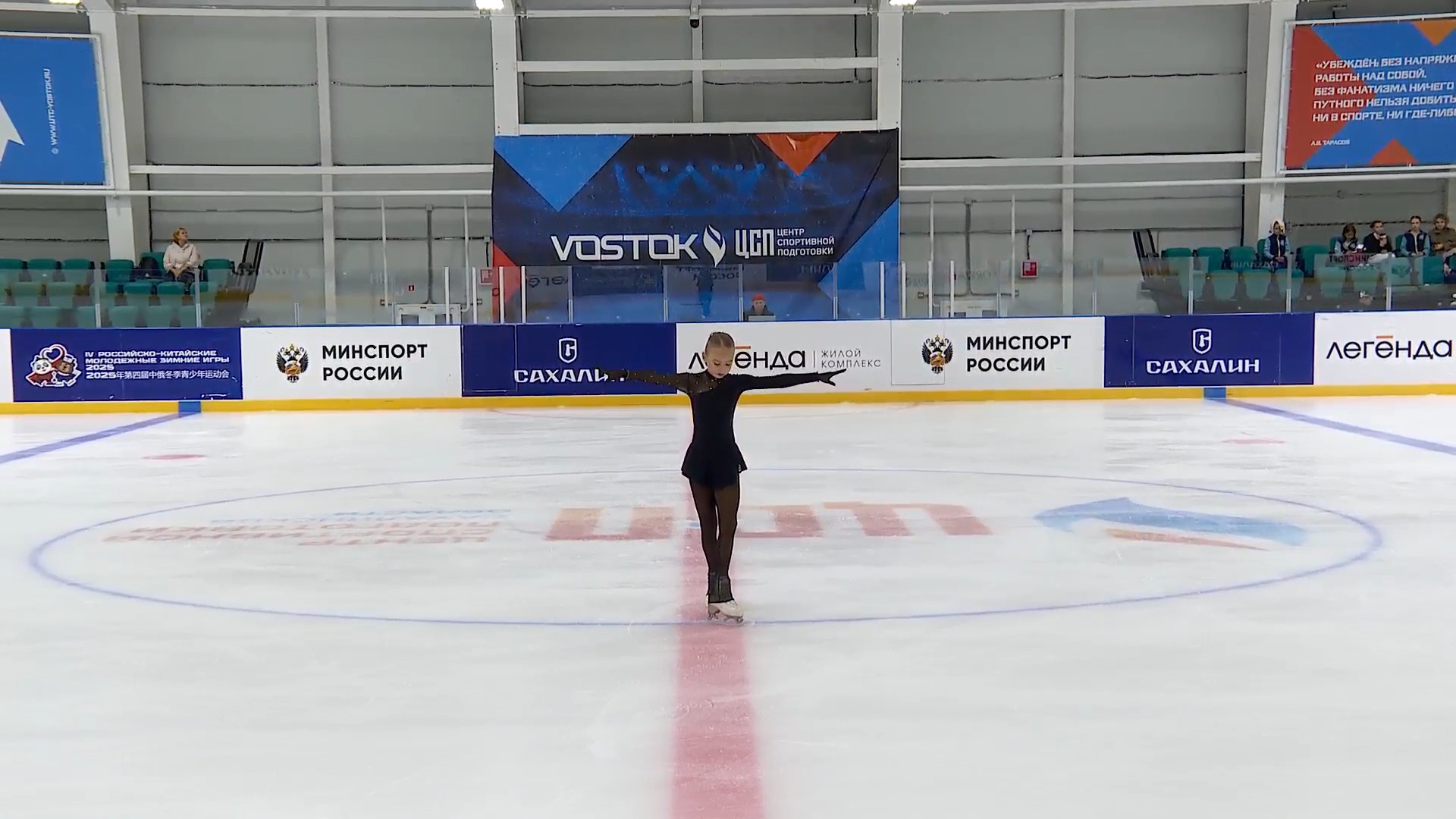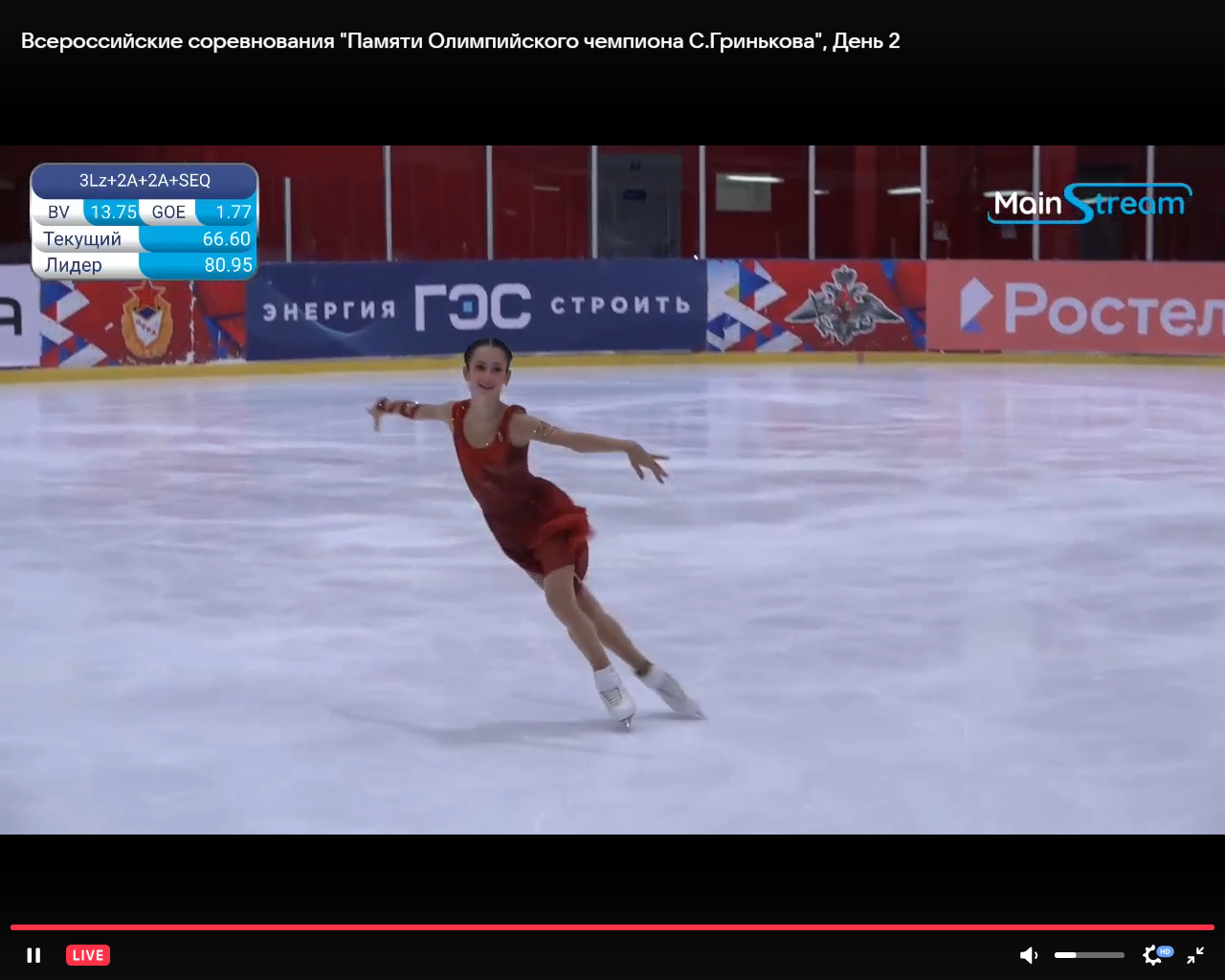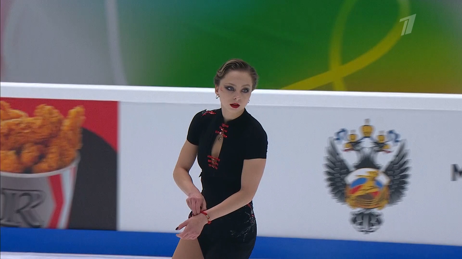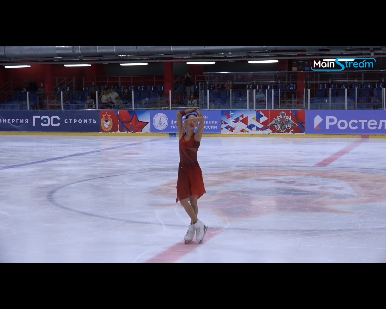 Алёна Витальевна Пяткина, СШ ОГАУ "Кристалл", Южно-Сахалинск в красном сарафане выдыхает у борта перед стартом 3r русская-народная дорожка 3sq2t танцует на зубчиках 2a fall с бести