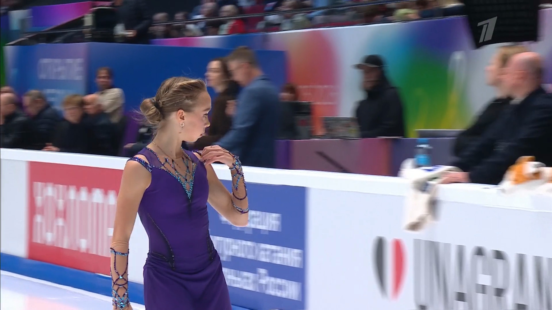 Алиса Двоеглазова Этеричка с каким-то омерзением сложила её олимпийку на руке что-то очень юниорское 2a в хв 3f 3z3t разворот в слайде на дорожке обратно в юниоры