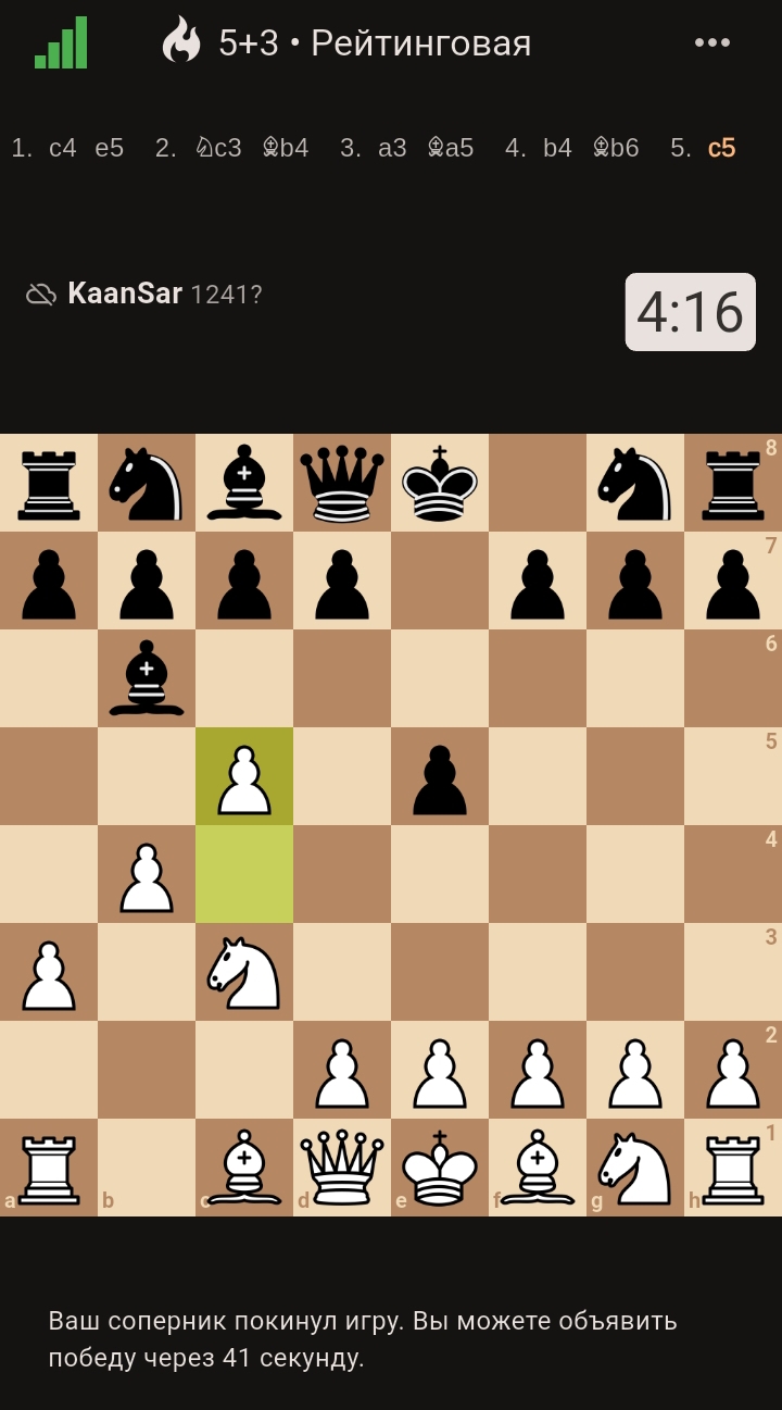 Моя последняя игра в классику на личессе пошла по интересному сценарию (я 2к ело, соперник на 200 ело выше). Разыгрываем дебют, за ~12 ходов я черными получаю по-лучше (его король все еще не рокирован, я уже вскрываю центр, инициатива перешла ко мне). Эти 12 ходов он делал примерно по 5 секунд на ход, как будто мы блиц играем, а не 30+30.