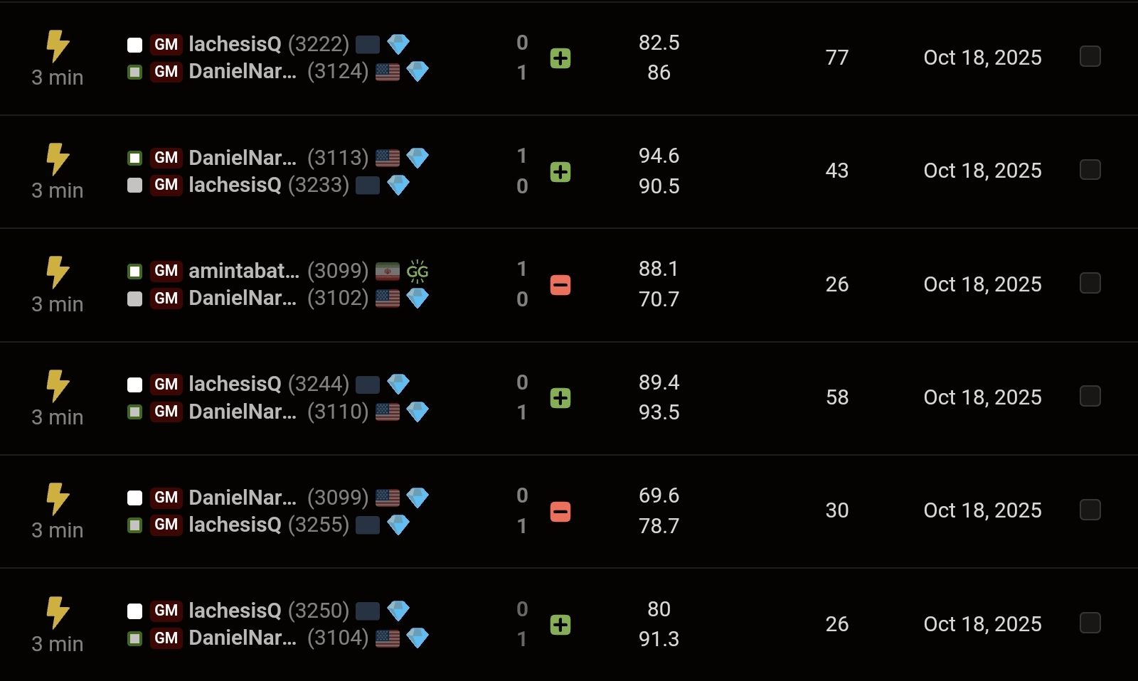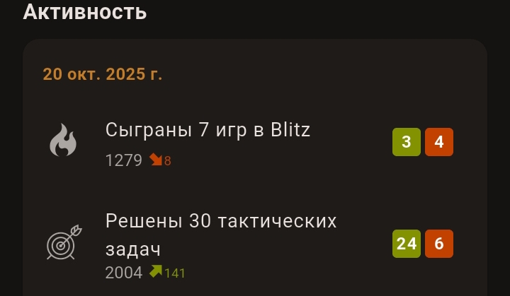 Будни 1500-додика: 1 партия: в конце дебюта думаю как бы красиво расположить фигуры - ни один вариант не нравится. Ладно, надоело думать, сделаю 0-0, он сделает какой-нибудь ход, и дальше видно будет. Ляпнул 0-0 - сразу получил мат на h7. 2 партия: 30 ходов - 98% точности 😎 Не получается играть ровно. То шыдэвры под 90% с 0 ошибок и 1-2 неточностей, где я на пару ходов вперед вижу потенциальную проблему за себя и за противника, то трешанина 60%, где я могу тупо в один ход прозевать фигуру или мат. Раньше я думал внимательность зависит от настроя и духа, но бывает так, что я в хорошем настроении и готов вырубать, но в какой-то момент зеваю, а бывает, что я чувствую, что я в тильте, но пошлепать фигурки хочется - я начинаю играть и выдаю офигенную партию без ошибок. Пока не понимаю как это контрить.