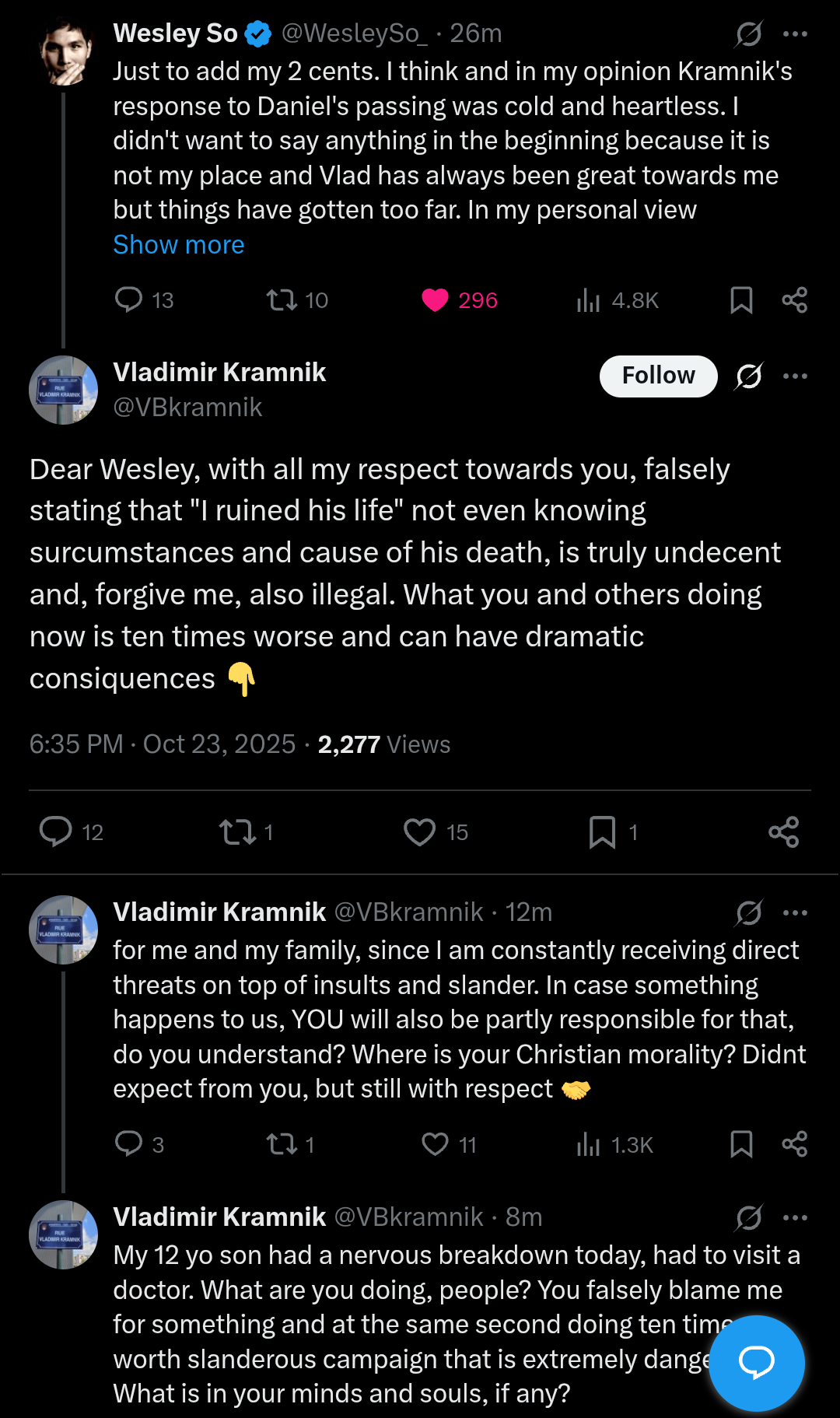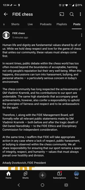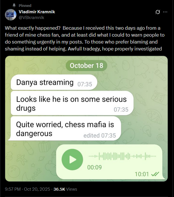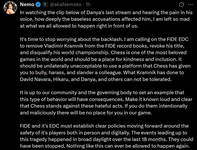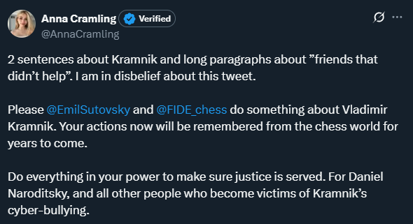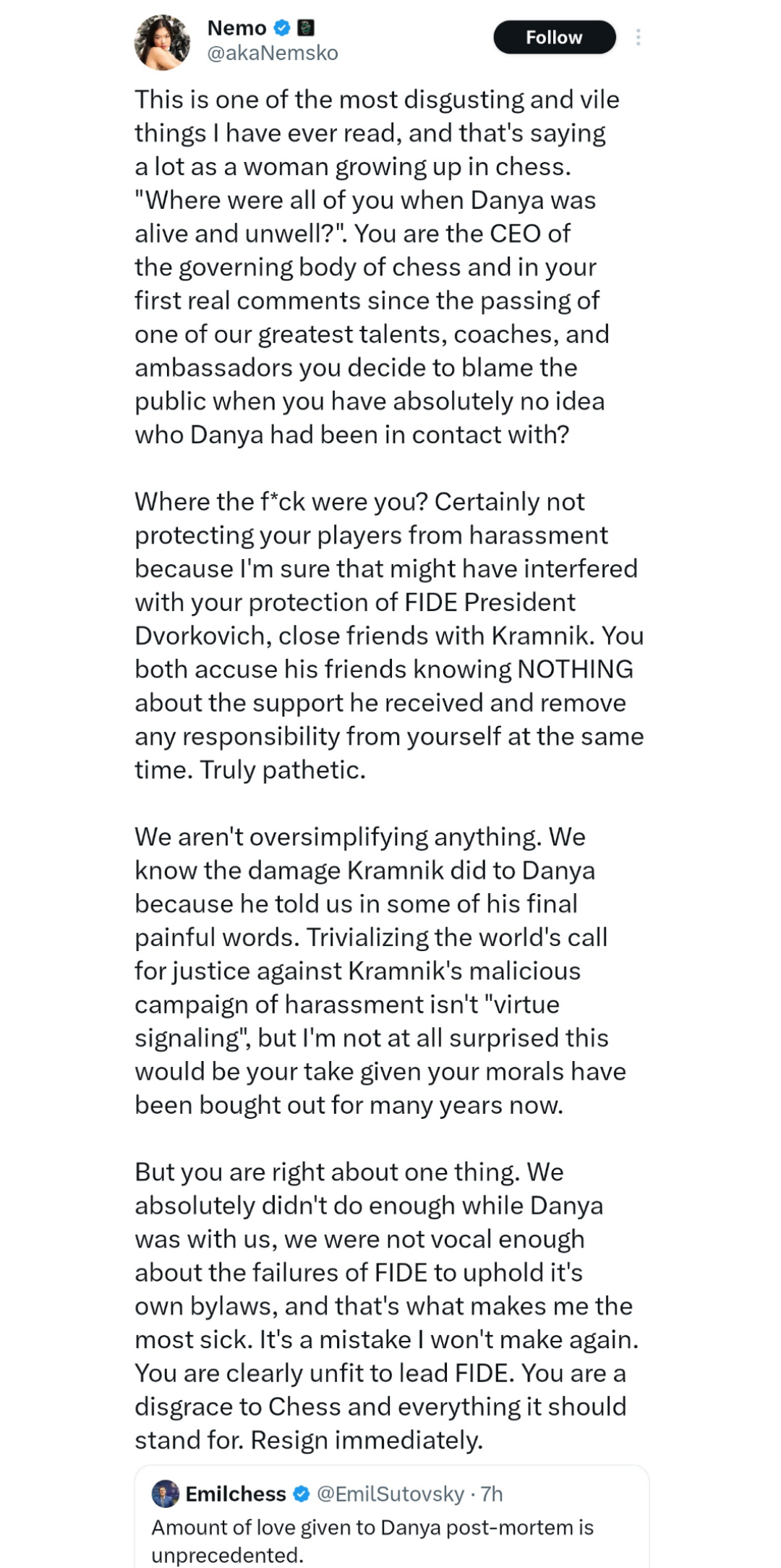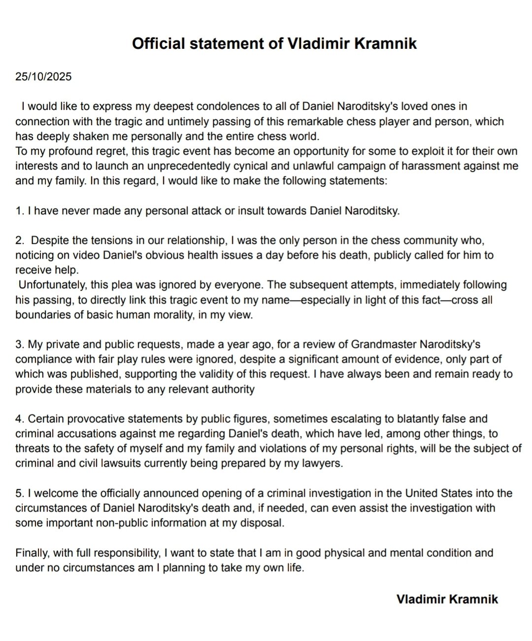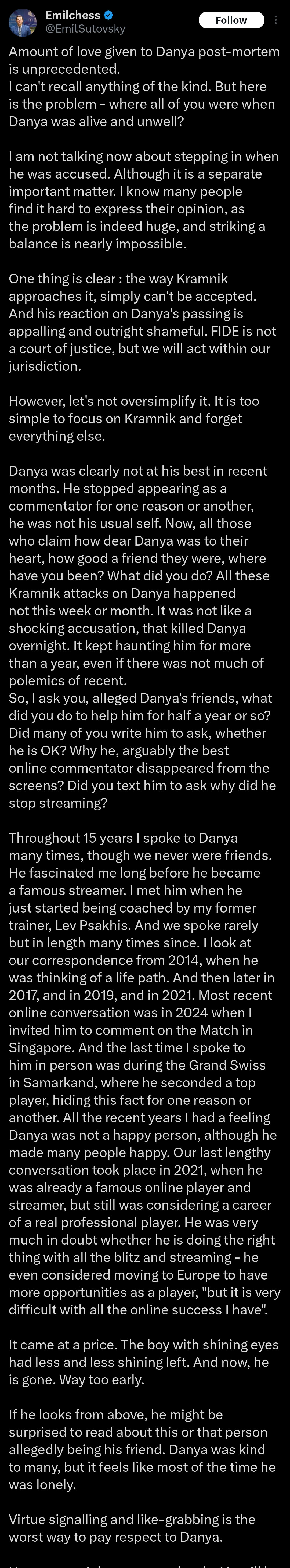 2. Несмотря на напряженность в наших отношениях, я был единственным человеком в шахматном сообществе, кто, заметив на видео очевидные проблемы со здоровьем Даниэла за день до его смерти, публично призвал ему помочь. К сожалению, этот призыв был проигнорирован всеми. Последующие попытки, сразу после его кончины, напрямую связать это трагическое событие с моим именем — особенно в свете этого факта — переходит все границы базовой человеческой морали, на мой взгляд.