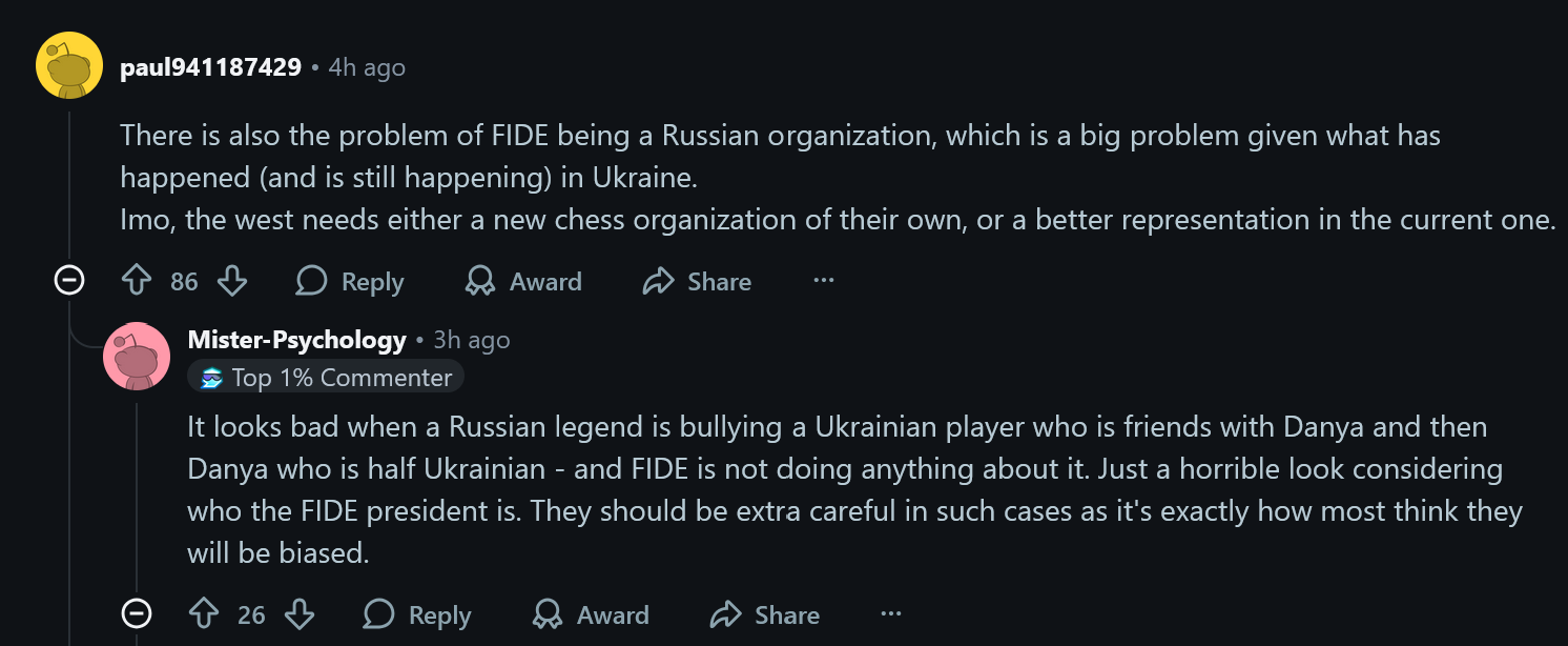 >>3247711 Во первых ты ниразу не палишься копипастой с усраинских новостных сайтов, это видно даже по трактовке ситуации А во вторых не только Дворкович в одиночку решает. Там будет плановое заседание и множество голосов. И вопрос об участии очевидно в декабре 2025 особо актуальный так как на повестке Шахматная Олимпиада в 2026 году. Поэтому это логично будет рассмотрено а не просто так чья то хотелка