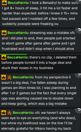 BeccaHarris: Конечно, стриминг был ошибкой, и я планировал его закончить, но потом люди начали прерывать игру за игрой, и я расстроился и не остановился, когда нужно было.