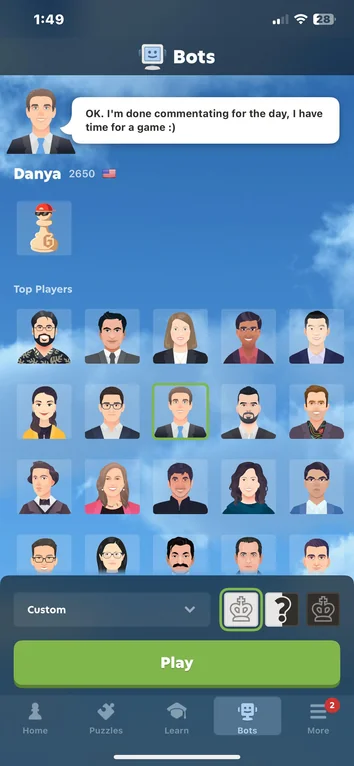 >>3249266 >Если твой рейтинг ниже 2200, то с вероятнстью 95% это копиум и тебя просто раскатали. Рейтинг мой 1300, его 1250 был. Так он несколько игр с другими в этот день сыграл со 100% точностью. Прошли 1,5 суток и сейчас наблюдаю, что его рейтинг уже 1420. Конечно и такое может быть, но как-то подозрительно.