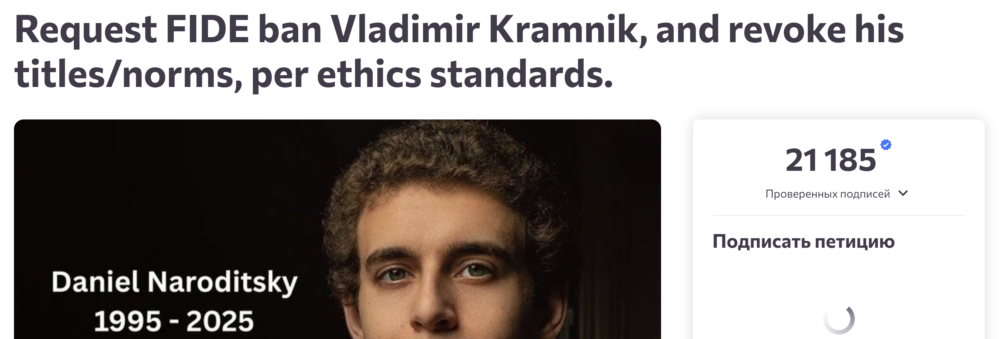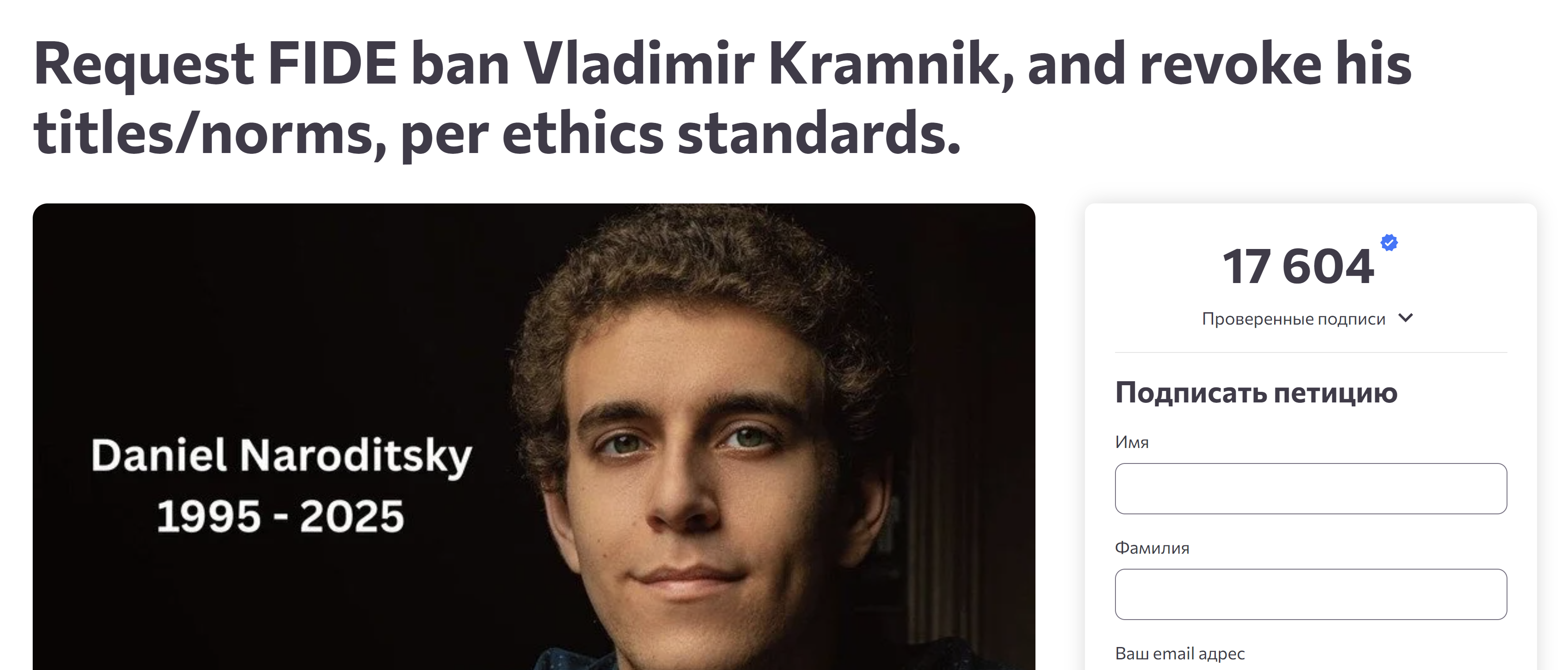 Petition "Sports Against Drugs!", we demand that the Charlotte Police Department, North Carolina, publish the cause of death of Grandmaster Naroditsky, initiate a criminal case against his drug dealer, and that FIDE and the American Chess Federation condemn the drug addict Naroditsky and deprive him of the title of US Blitz Champion. (предагайте корректировку)