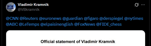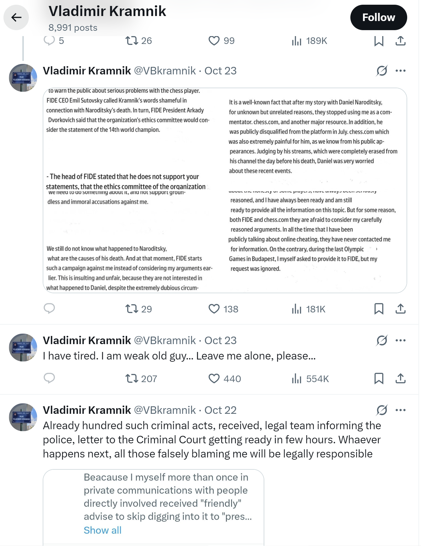 3. Мои частные и публичные запросы, сделанные год назад, о проверке соблюдения гроссмейстером Народицким правил fair play были проигнорированы, несмотря на значительное количество доказательств, только часть которых была опубликована, подтверждающих обоснованность этого запроса. Я всегда был и остаюсь готовым предоставить эти материалы любому компетентному органу.