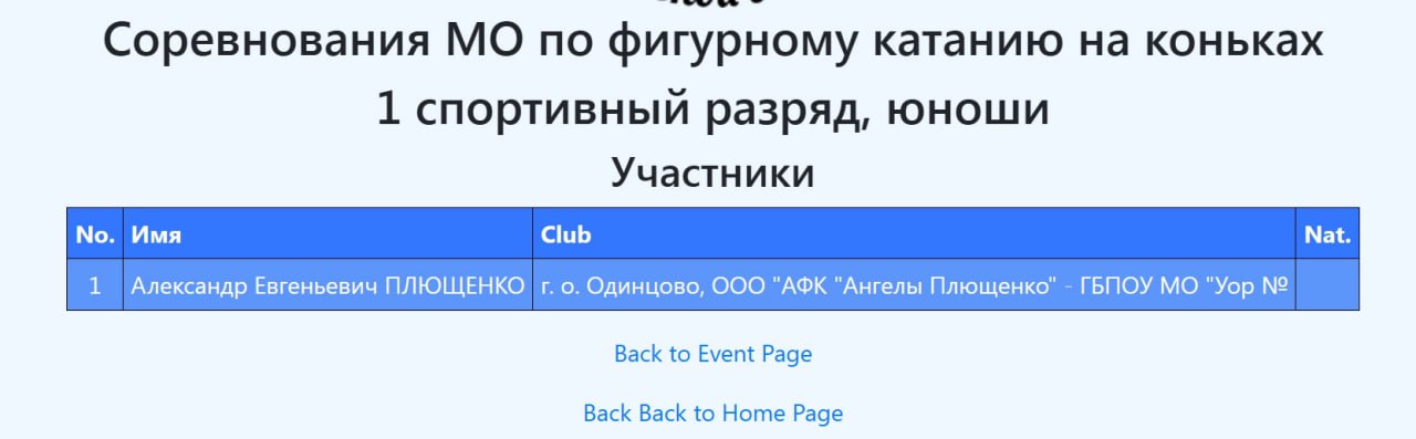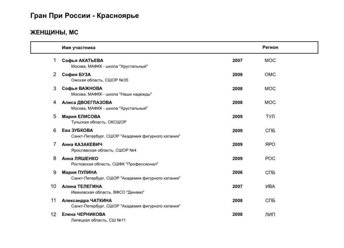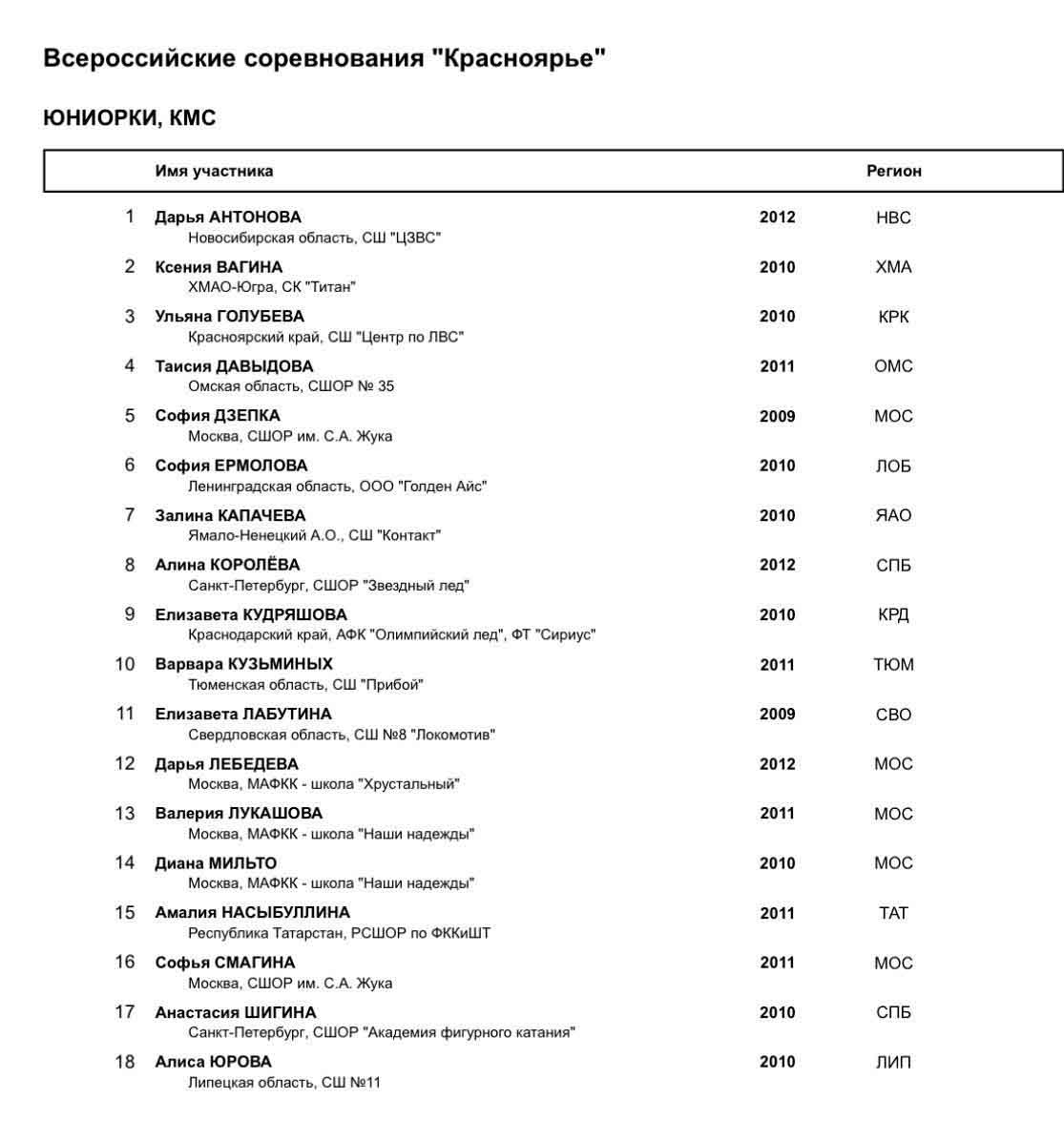 >>3251047 25-26 октября, Спортивные соревнования Московской области по фигурному катанию на коньках среди мальчиков и девочек 6-9 лет, мальчиков и девочек 8-12 лет, юношей и девушек 11-17 лет (СМ-1231), Наро-Фоминск, ЛД "Наро-Фоминск" КМС: Яна Максимовна АСТАШЕНКОВА, Елена Валерьевна КОСТЫЛЕВА; 1 сп.: Гном-Гномыч,Мария Николаевна КЛИМЕНКО, Дарья Олеговна КОБИЦКАЯ, Эмилия Денисовна КУЦЕВА, Ульяна Александровна МАРТЫНЕНКО (не та), София Александровна МАРТЫШИНА, Елизавета Васильевна НИКОЛАЕВА, Ксения Витальевна СИДОРОВСКАЯ, Марьяна Юрьевна ШАКИРОВА и др. Инфо: http://ffkkmo.ru/competition/спортивные-соревнования-московской-128/ Табло: http://ffkkmo.ru/events/2526/nf2526/ Транса: https://vk.com/skatingvision