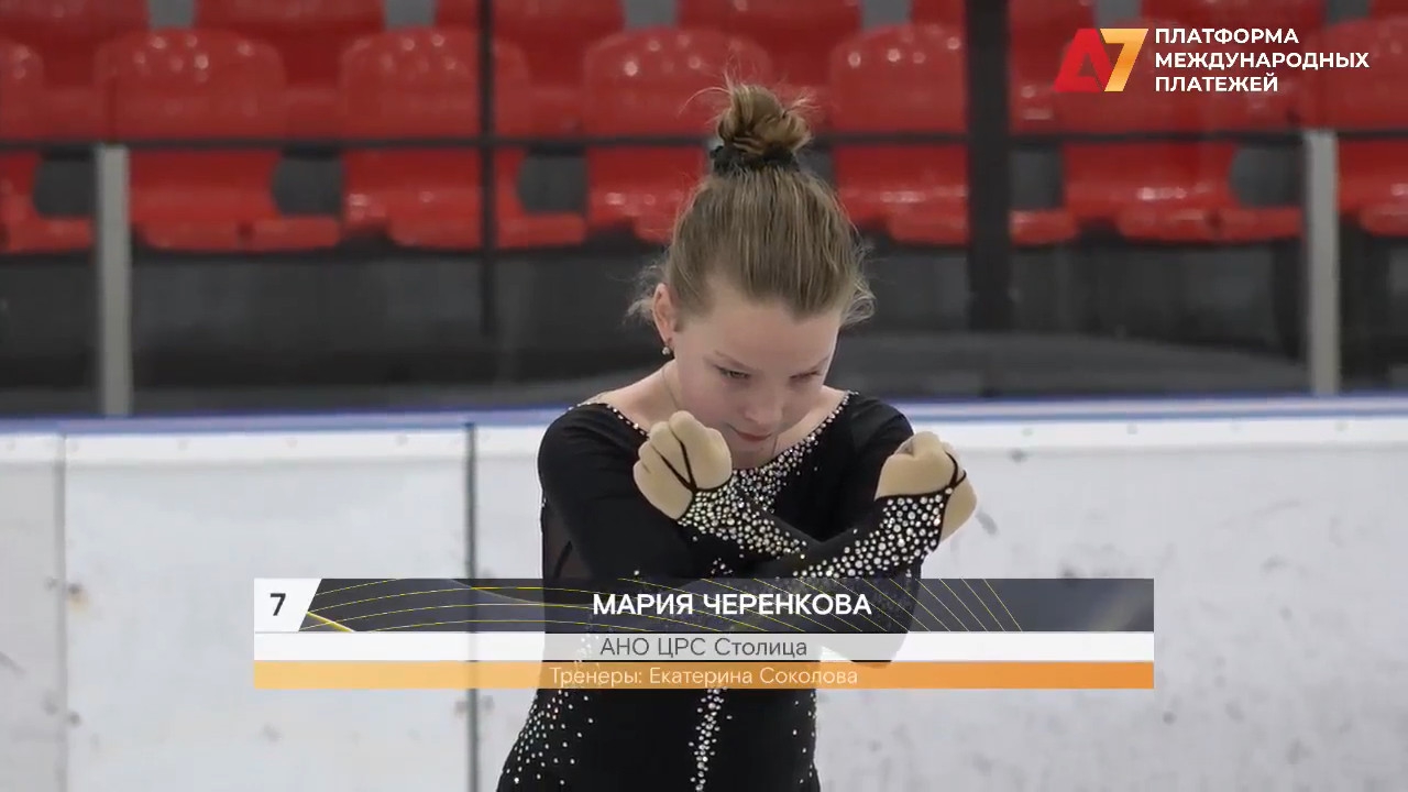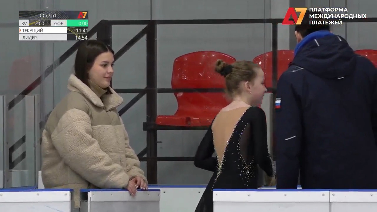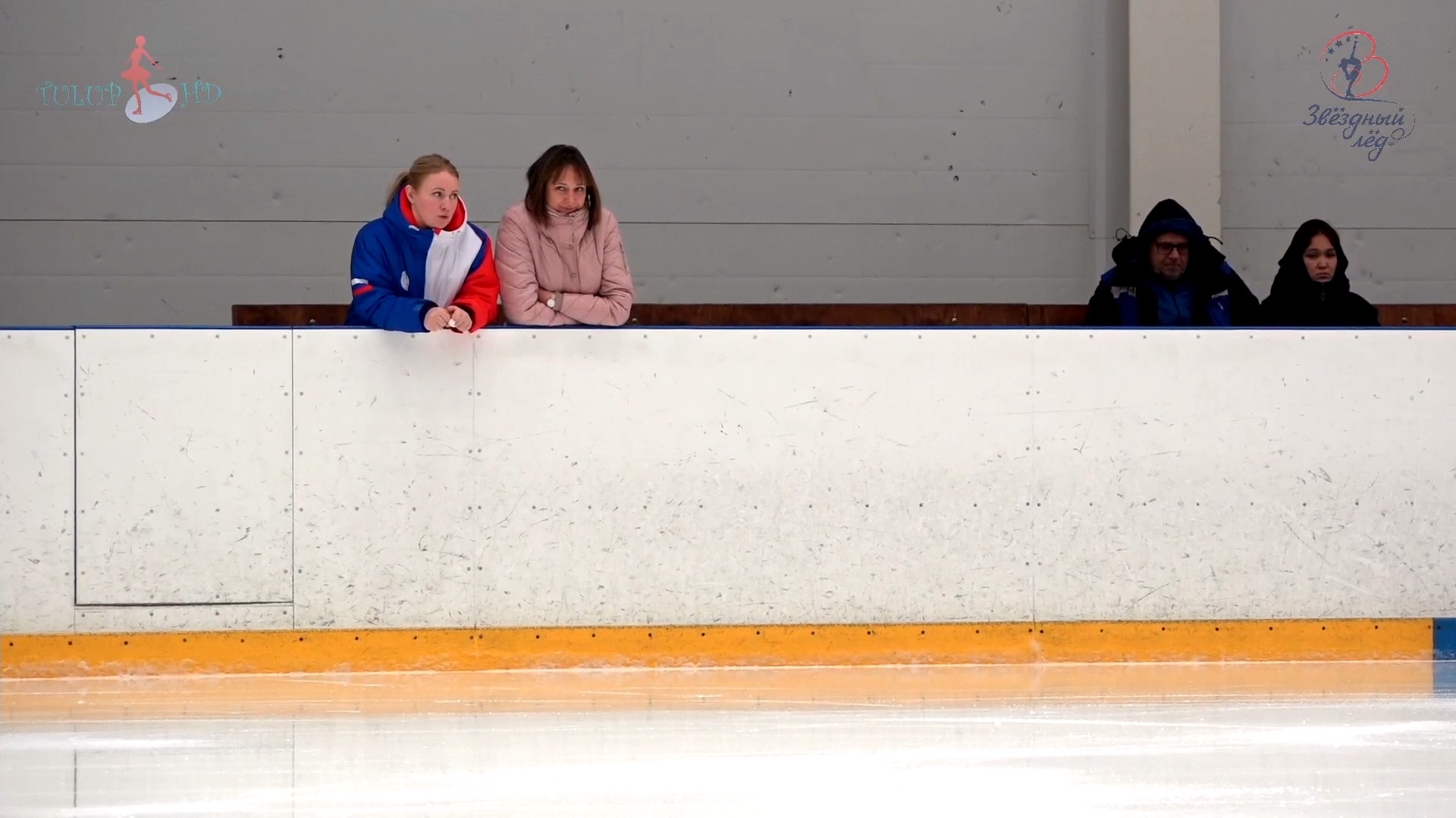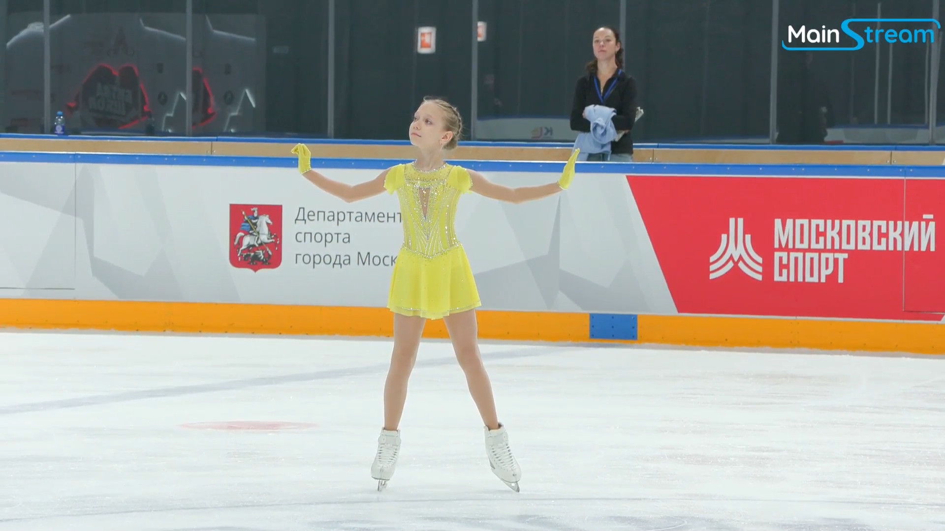 Елизавета Николаевна ЧЕРНЕНКО с А.Ю. СПб, МО Введенский СПБ ГБУ ДО СШОР "Звёздный лёд" жёлтый lalaland с жёлтыми перчатками 2a ho с А.Ю. захода 2z 2a2t ho с А.Ю. захода chsq1 бежит на зубчиках развязались шнурки на chsq1, завязывает у борта и заскакивает в калитку. музыку выключают. На скамейке ей завязывают шнурки. Самая завязать шнурки не может судя по всему. продолжает chsq1 прыжок в шпагат 2f 2z2t закрутило в тройку 2r ho прыжок в шпагат 2f so