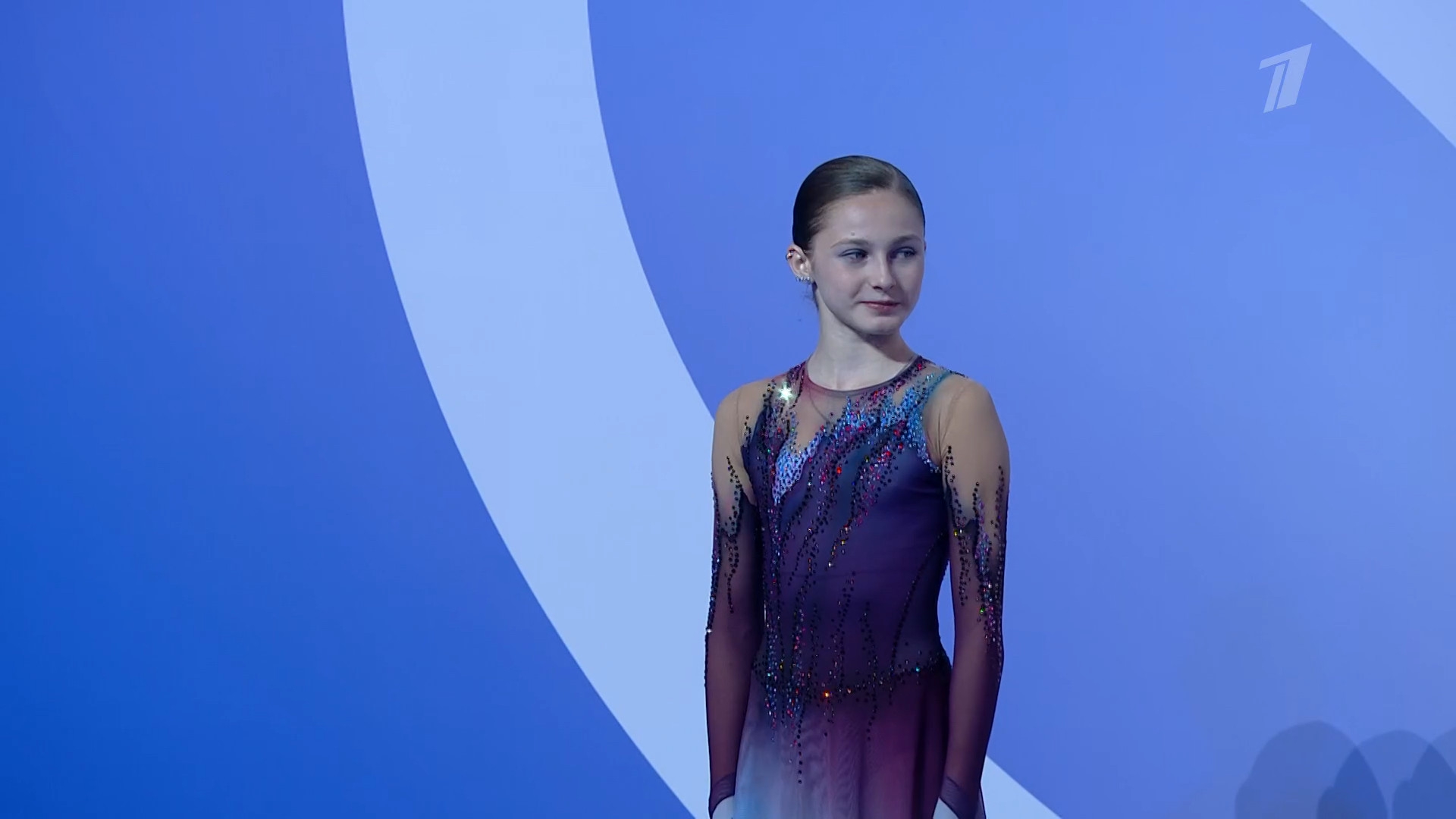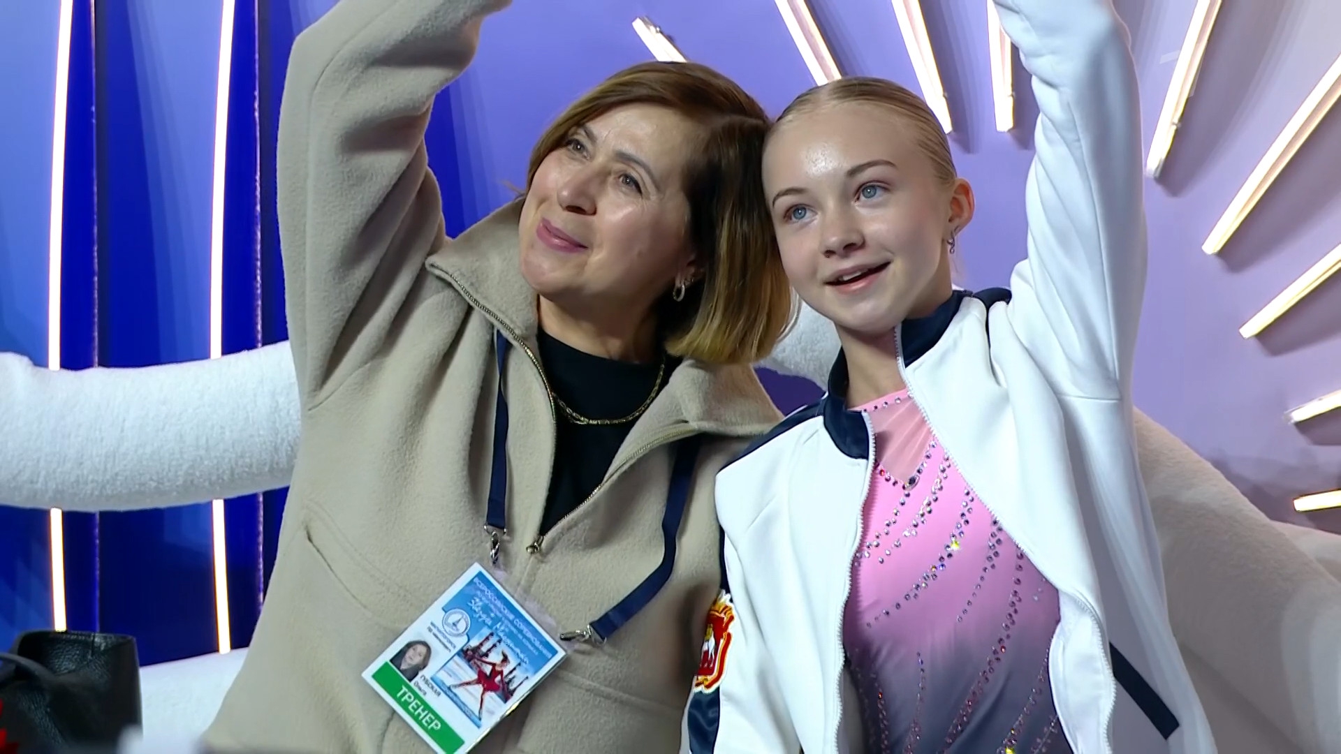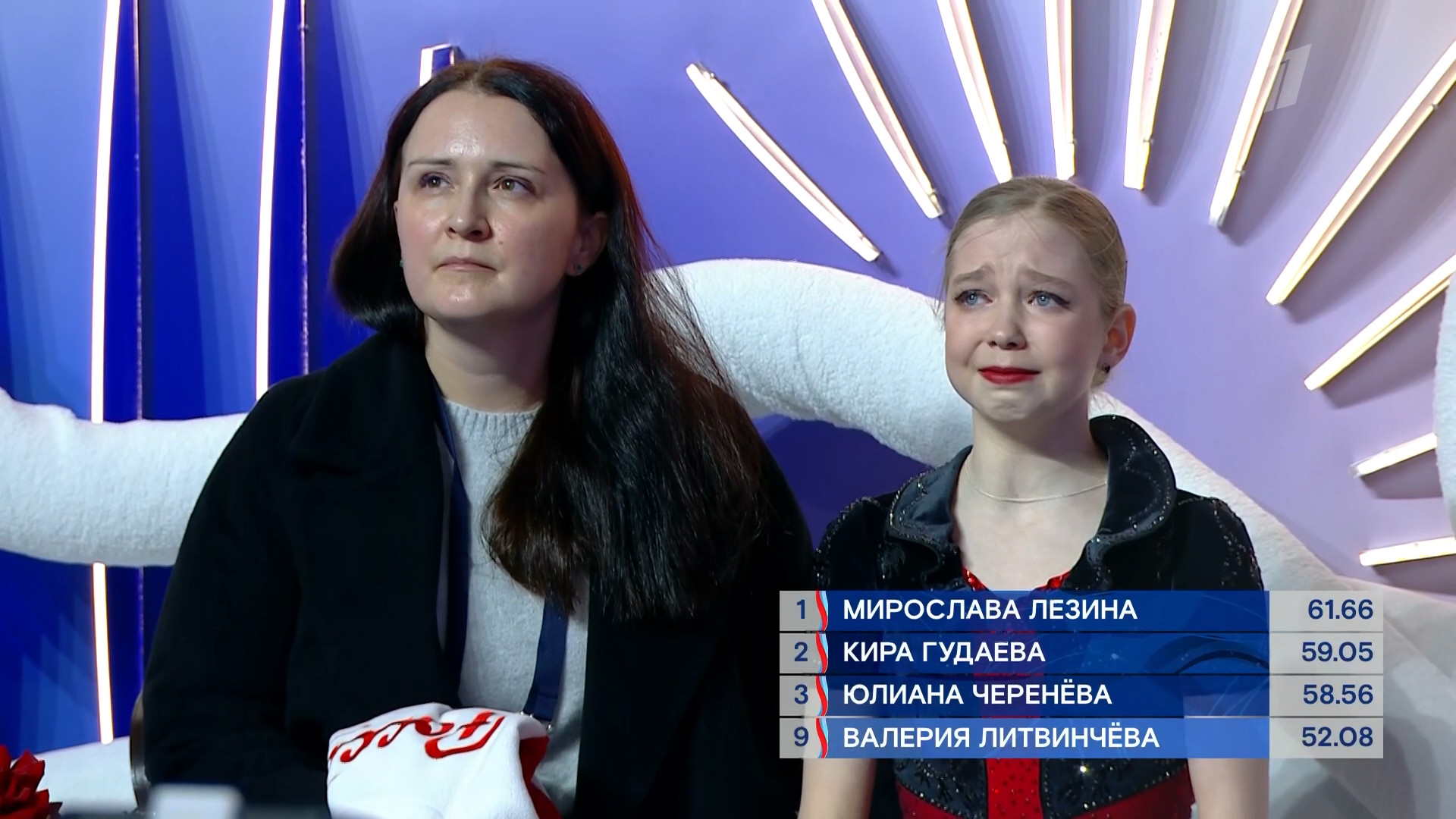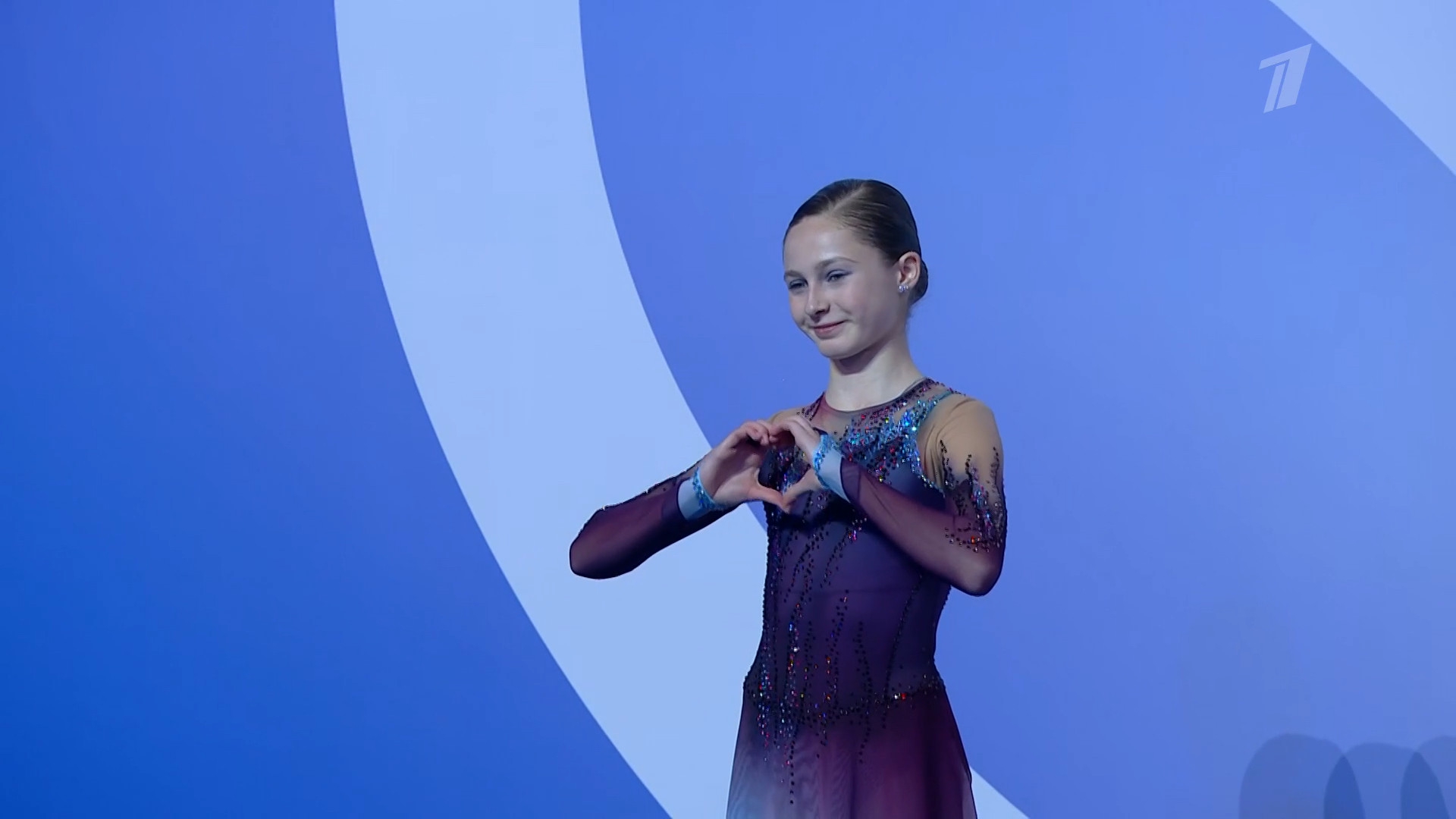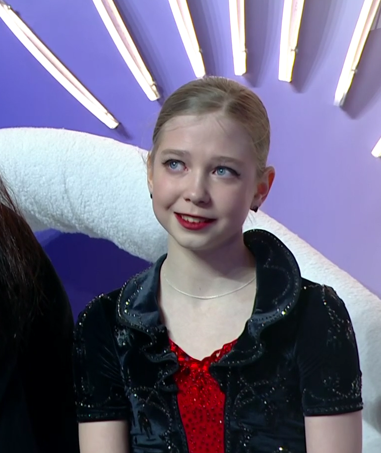 Екатерина Алексеевна КОРЧАЖНИКОВА, с мамой гимнастика на льду очень красивая, на комбинезоне что-то импрессионистское в духе ван-гога звездная ночь 2a в хв 3f 3zq?3t stsq2 бежит на судей перед финальным ccosp4