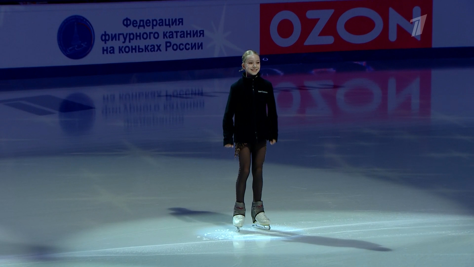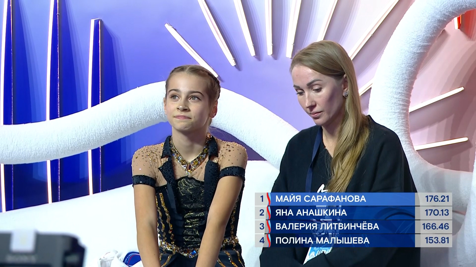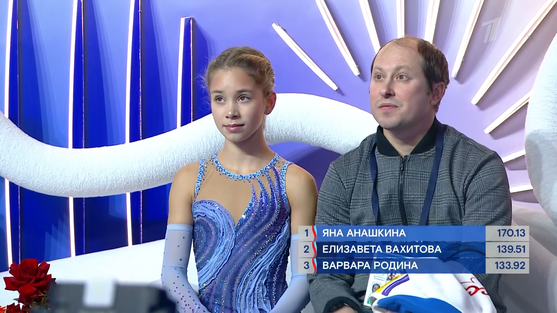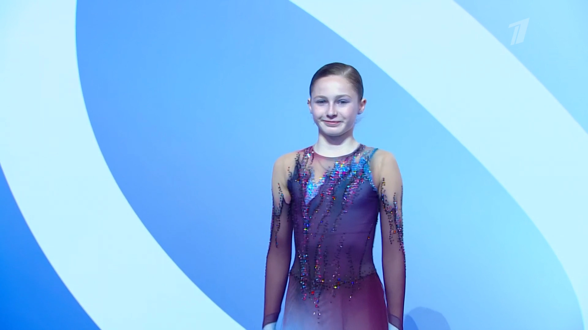 Екатерина Алексеевна КОРЧАЖНИКОВА, с мамой гимнастика на льду очень красивая, на комбинезоне что-то импрессионистское в духе ван-гога звездная ночь 2a в хв 3f 3zq?3t stsq2 бежит на судей перед финальным ccosp4