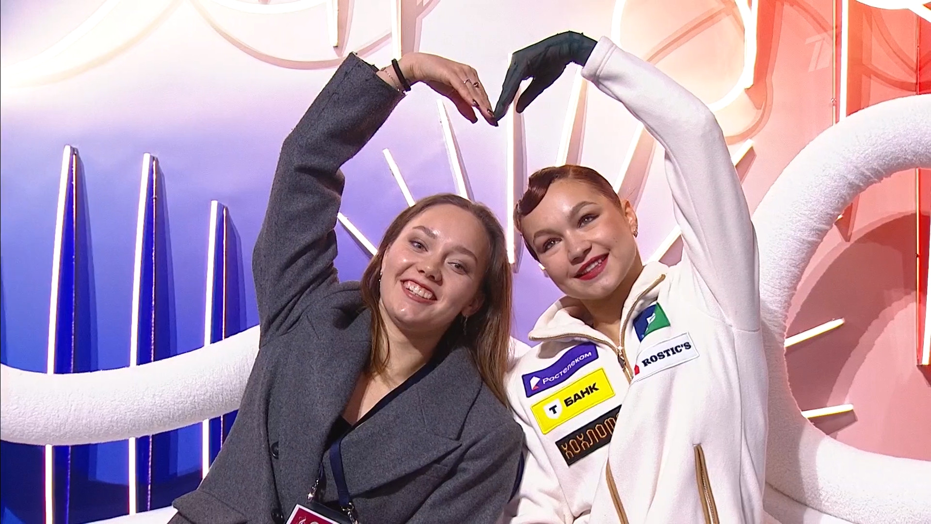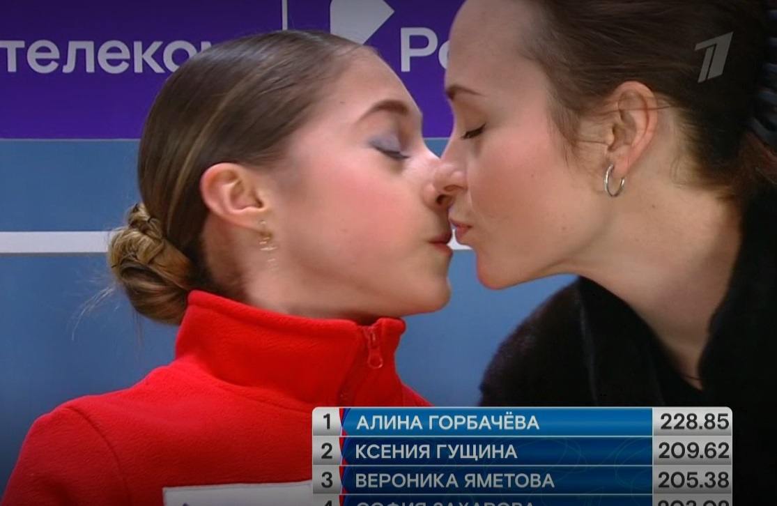 Юлиана Евгеньевна СЛАКВА с Ольгой Агапкиной Агапкина целует в лобик trendsetting blondie 2a so на руки 3t<2t1a 2a2t в подпрыжку 3sq? ho chsq1 прыжок в шпагат 3t< (<<?) (3tq) 2z!<