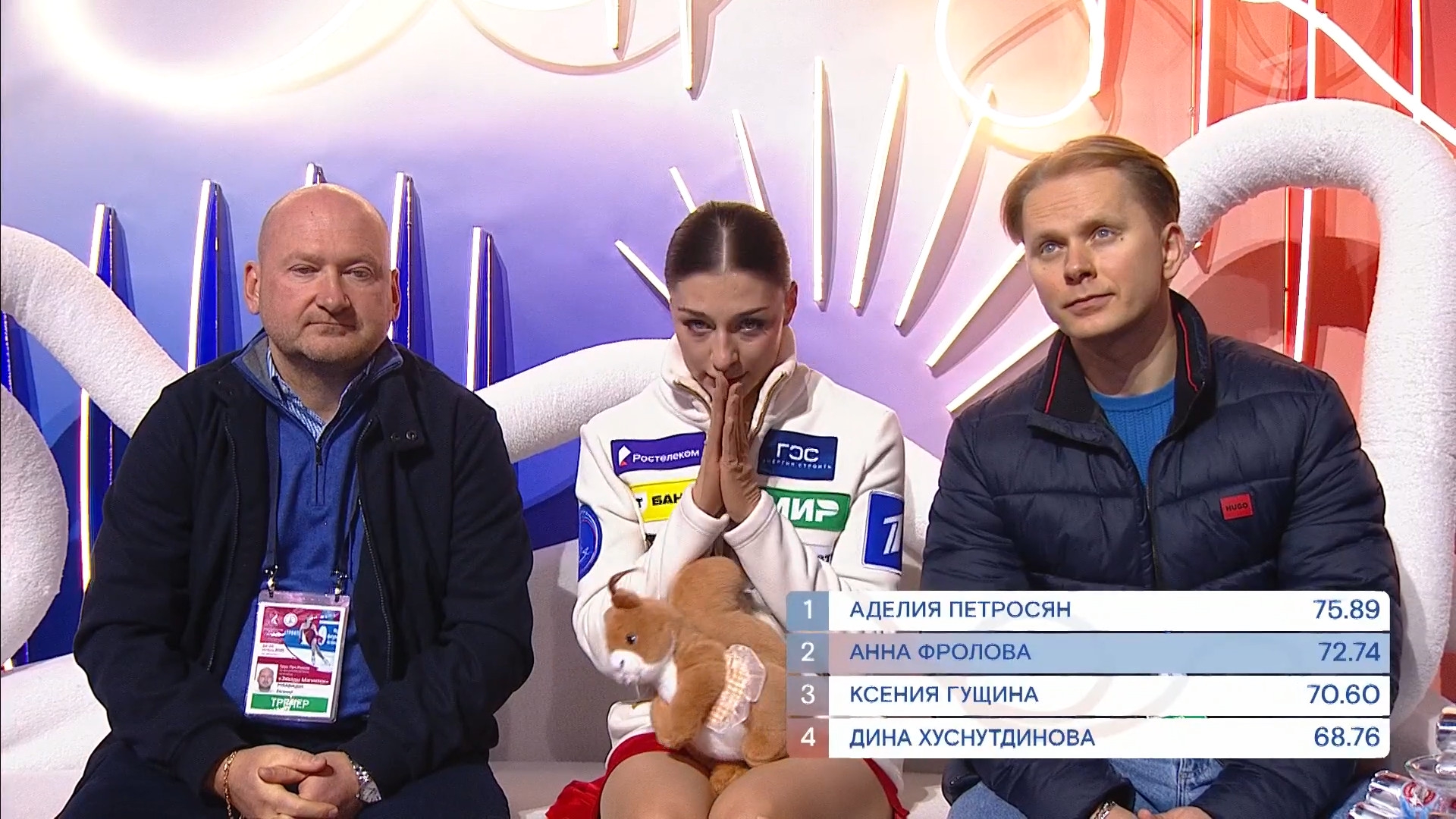 А.Фролова 3z3t 3f2t 3r<? 2a цуревыезд 3z2a2t 3f<? 3s stsq2 всё то же впечатление, что она не почти тренируется. При этом всё прыгает >Спасибо первому каналу за возможность наблюдать Дослушать эту ценную информацию от Ягудина не удалось.
