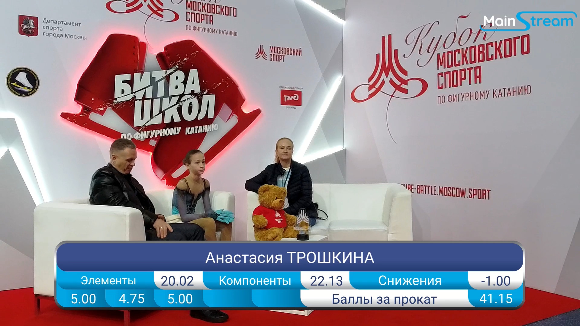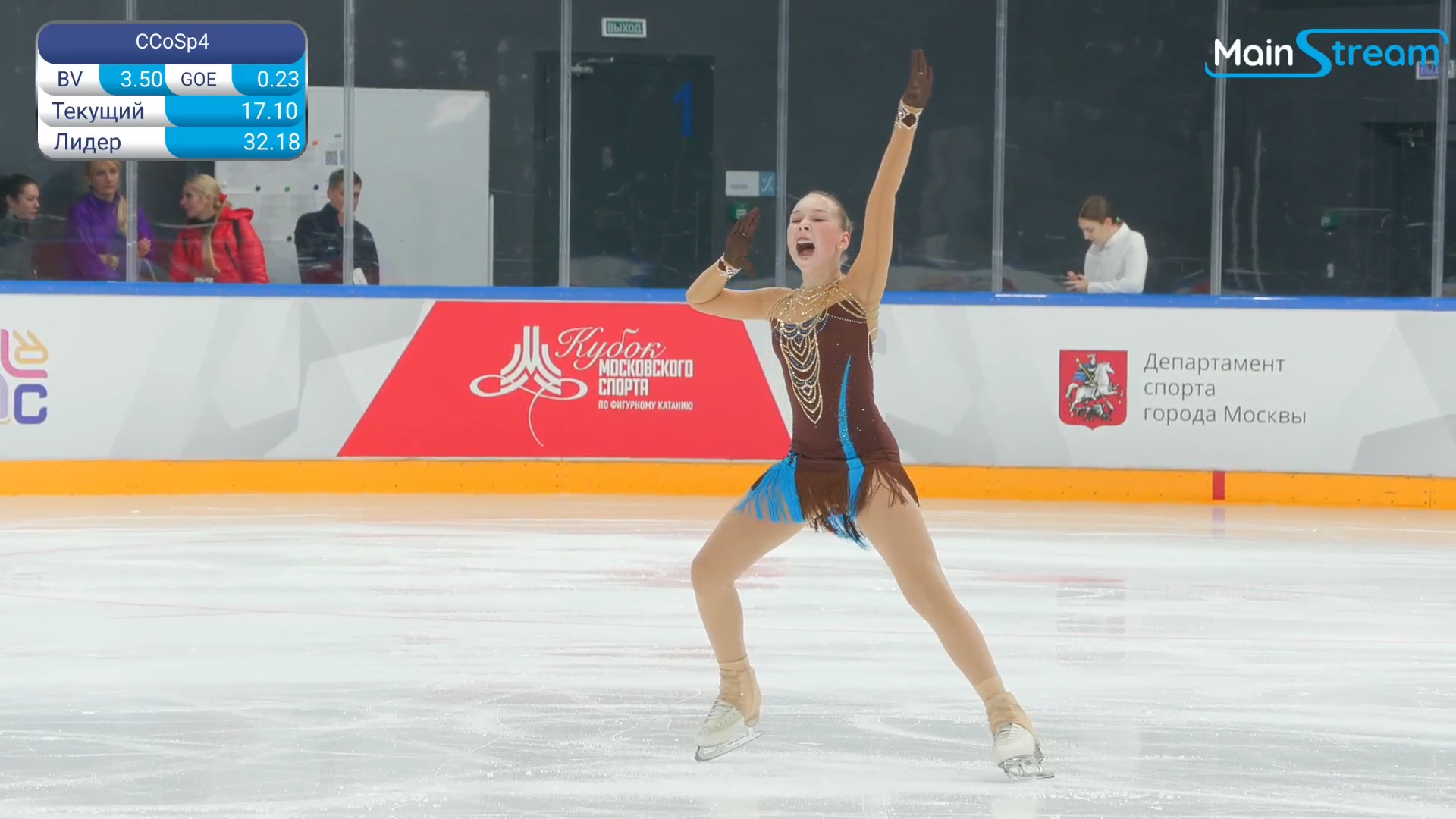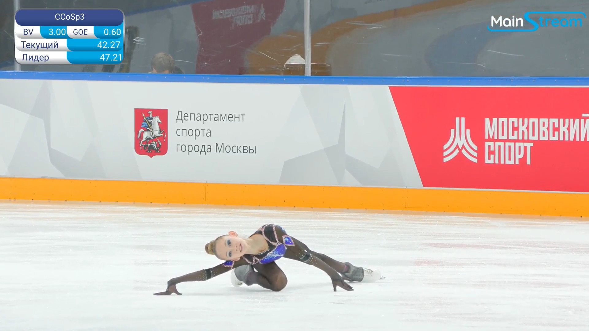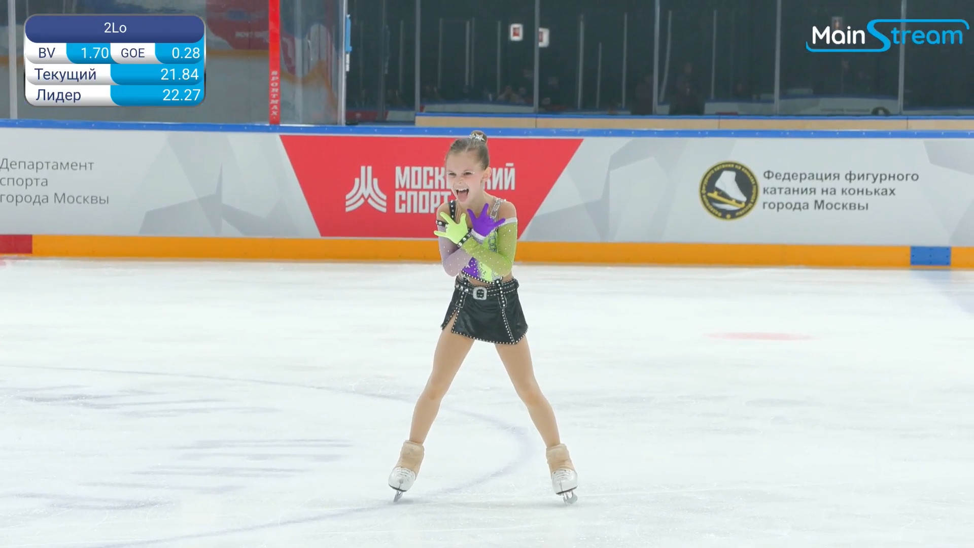 Мария Артёмовна АРТЁМОВА МАУ ДО СШОР имени Ю. Е. Ляпкина Trinity 3z высокий, пролётный 3s 3f<?2t тоже пролётно 3r q? chsq1 3z q? 2t (бабочка?) (3zq) пролётно 3f!q?3t< fall 2a< stsq2 mona liza overdirve запыхалась