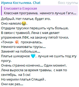 >Смотрела почти две разминки....... Базылюк. >Какой у неë сейчас рост? 1 метр 60 ? Выглядит на него. Но коленки - страшные пять маслов торчат. Это говорит о голодовке спортсменки...... Платье в короткой ужасное. Тряпка небрежная, постельных ...... Нюдовых тонов....... На Маргариту, что не надень - она несмотрибельная 🤣😭😥 фигуристка на льду. Чего не сказать о Парсеговой. Красота спасëт МИР. Ладненькая. Но без УСИ.... Эта фраза, перечëркивает еë красоту.... Программы Базылюк смотрела, только в онлайн... Все квады на месте. ☝ Там мама 😭не даст потерять квады... Прыжки как и были в позе зародыша - не красивые. Да и в ПП , в отличие от КП, Базылюк НЕ ❌отметили не одного из двух , прямых рёбер на тройном лутце. Тянули, тянули и вытянули выше Вики. Очень жаль. Вика - потрясающий джампер. Очень лëгкие прыжки. Огромной высоты. Вика - Это самый опасный соперник моей Лене. Парсегова , выдала свой максимум. Без эмоциональна. Но красива на льду. И это очень подкупает. Пусть скажет спасибо, что осталась без УСИ, Мамо Люде...... Теперь я представляю, как ей было здесь тяжело тренироваться, с каждодневными кейсами от семьи С. Гое нищенские у Парсеговой. Очень обидно было за малышку Лезину. Упала на ровном месте.... Хорошенькая, но Не фартовая. Не хуже, чем многие.... Но не отбирается на ПР... второй сезон. Если ей не дадут второй этап, то точно..... Мимо.