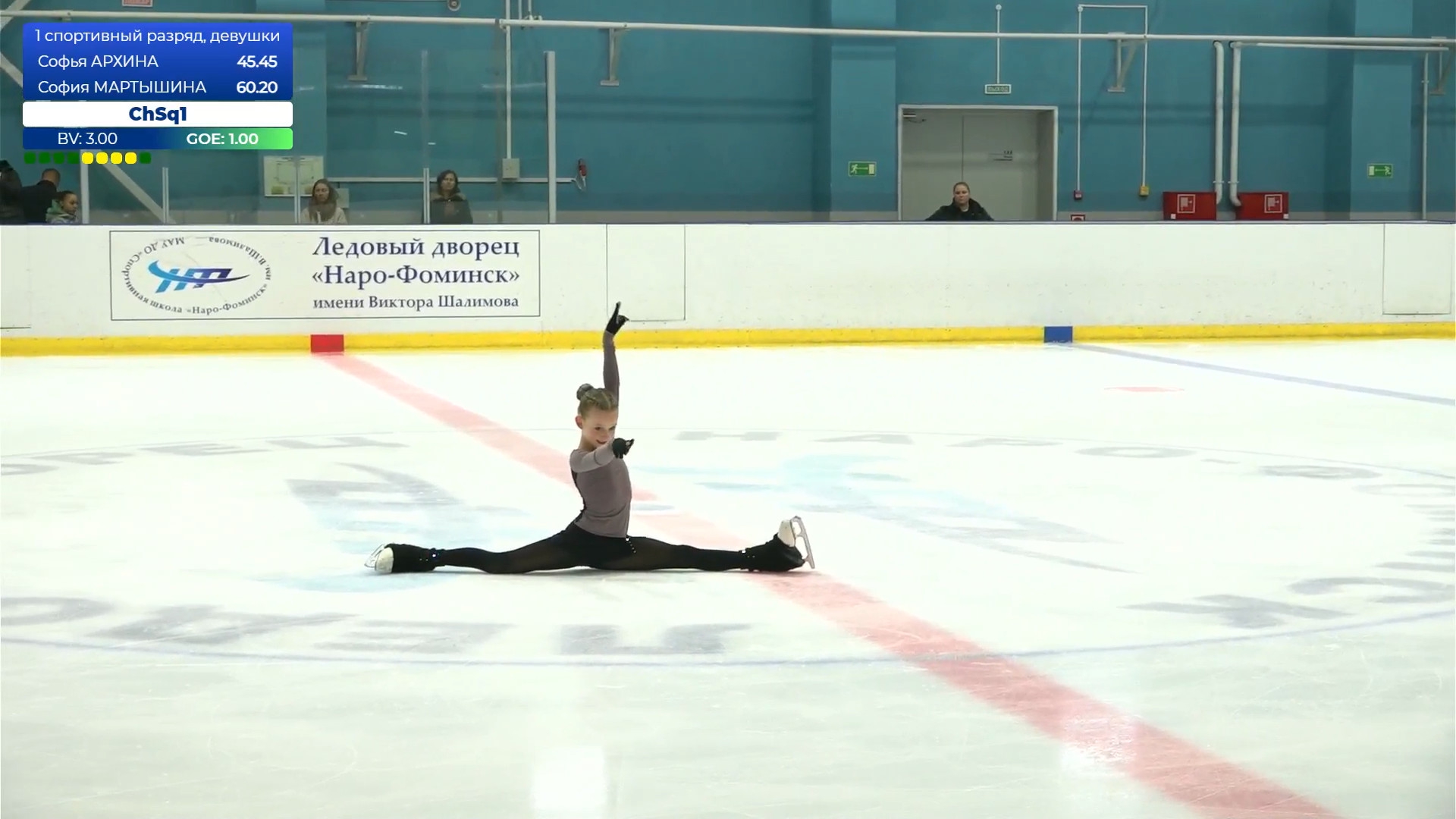 София Александровна МАРТЫШИНА г. о. Одинцово, ООО "АФК "Ангелы Плющенко" - ГБПОУ МО "Уор №1" 3s в твизлы 3r2t 3r 3z3t<<? 3z2a2a 3f!? танцует chsq1 трясёт плечиками, пьяный кинг-конг в бести, прыжок в шпагат шпагат в конце
