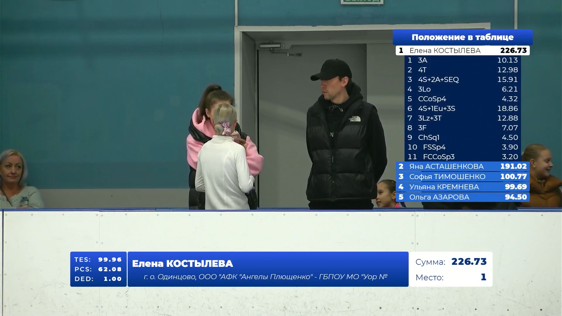 Елена Валерьевна КОСТЫЛЕВА, 2011, с триумвиратом, Митрофанова переживает г. о. Одинцово, ООО "АФК "Ангелы Плющенко" - ГБПОУ МО "Уор №1" Вуаля в голубом, если не врачи, то хотя бы судьи и федерация таки привели в ум Ирину Алексеевну. 3a3t в твизлы с захода на полкатка 2a с какого-то нового хз в такой же хв с руками сзади 1r с гидроблейда (разорвало) Плющ всё испоганил за год stsq3