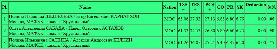 Элина Александровна СОКОЛОВСКАЯ, 13 лет (2012-07-20), Никита Бочков МАУ ДО СШОР имени Ю. Е. Ляпкина 3r< fall 3s<< закрутило кубарем fall +combo stsq2 2a< на руки fall? не успела