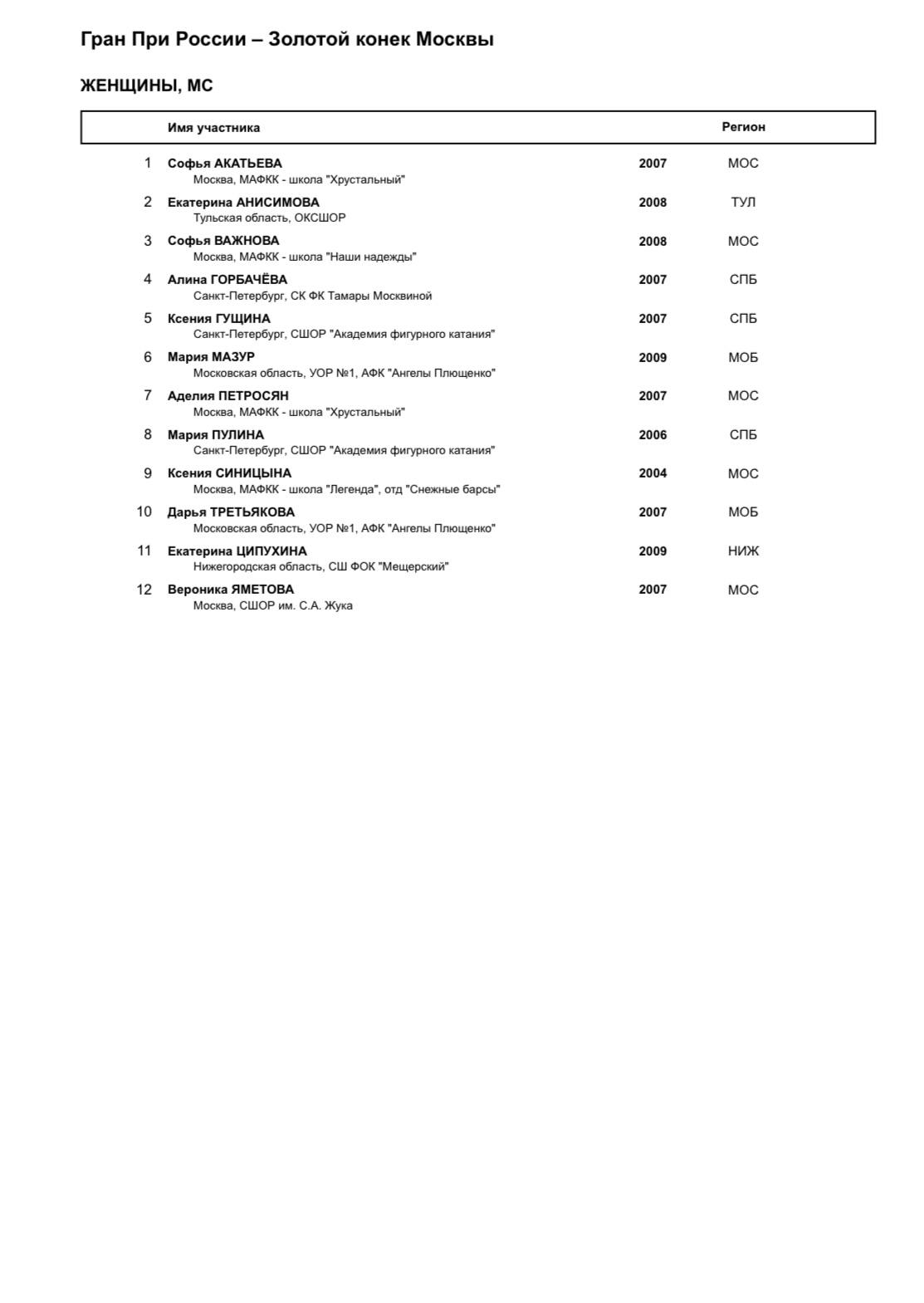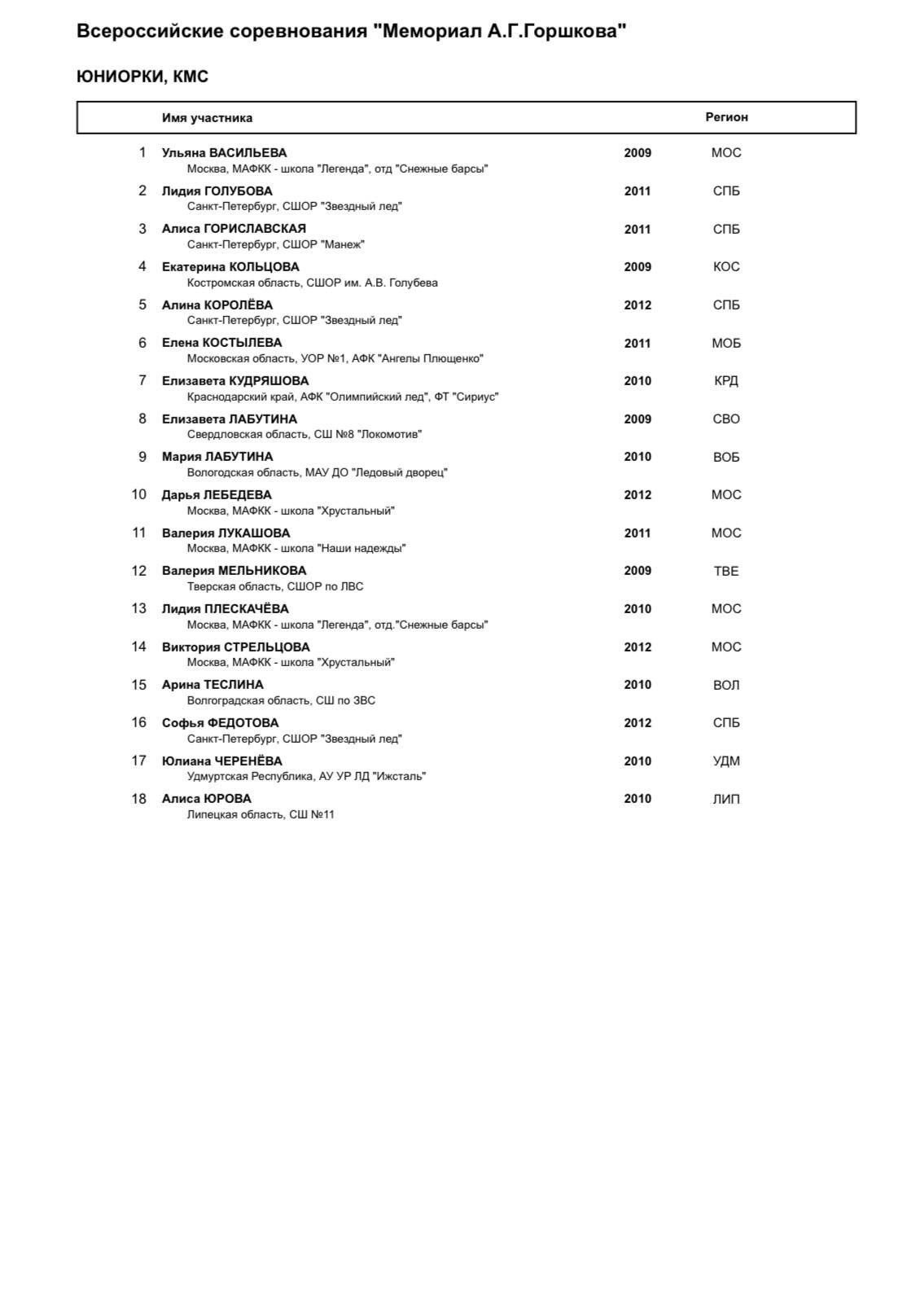 28 октября https://vk.com/video-156759190_456239124 13.35-17.10 – 1 сп., девушки, КП (подготовка льда после 3-й и 5-й разминок) 18.15-19.45 – КМС, юниорки, КП 19.45-20.30 – КМС, юноши, МС, женщины, мужчины, КП