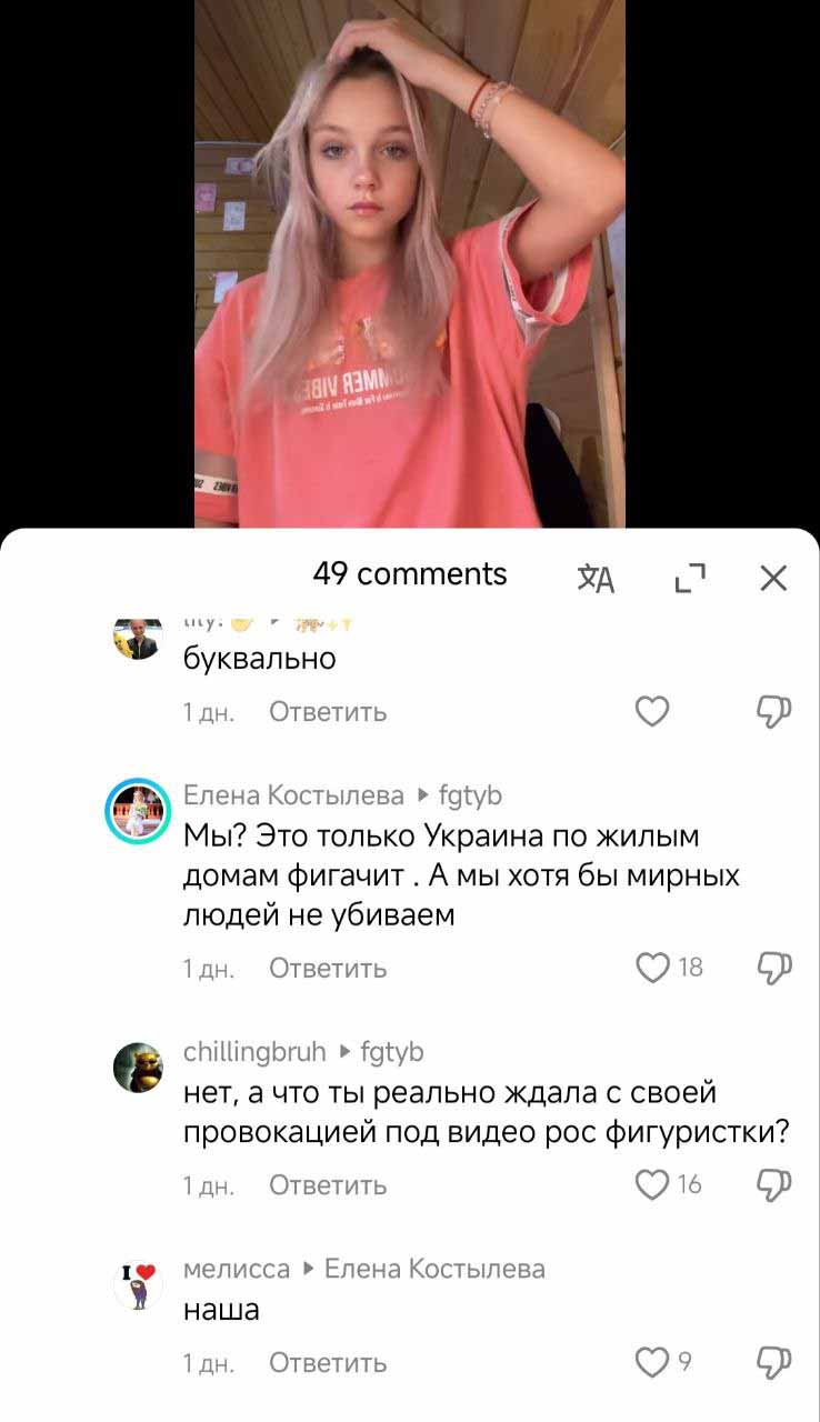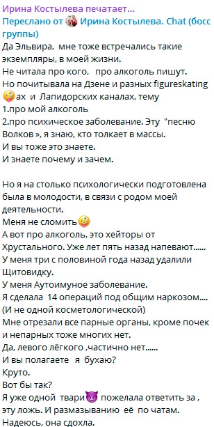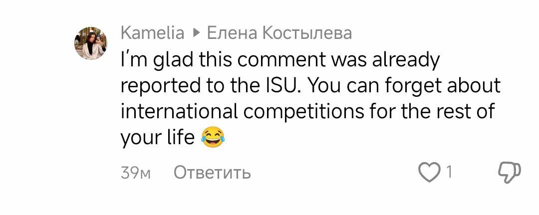 >"У Костылевой прекрасная программа! Между элементами у нее достаточно связок, трудно этого не заметить. Комментатор сказала, что тренерам необходимо подумать о компонентах между прыжками. Не знаю, почему она их не видела. Неприлично говорить о том, что у Лены нет связок. У нее все время идут шаги. Предлагаю гордиться ее выступлением.