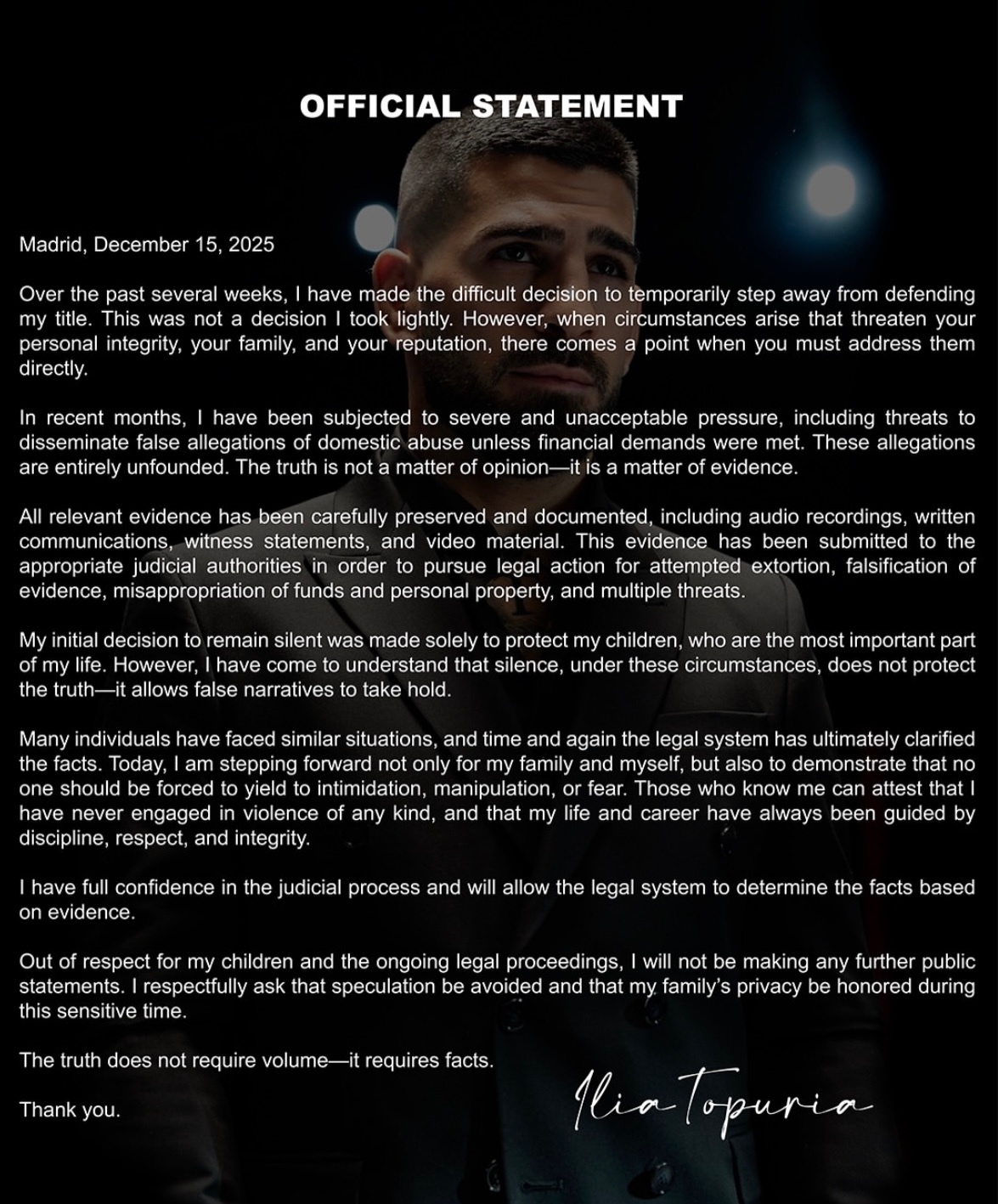 Многие люди сталкивались с подобными ситуациями, и раз за разом правовая система в конечном итоге устанавливала истину. Сегодня я выступаю не только ради своей семьи и самого себя, но и для того, чтобы показать: никто не должен поддаваться запугиванию, манипуляциям или страху. Те, кто меня знают, могут подтвердить, что я никогда не прибегал к насилию в какой-либо форме, и что моя жизнь и карьера всегда основывались на дисциплине, уважении и честности.
