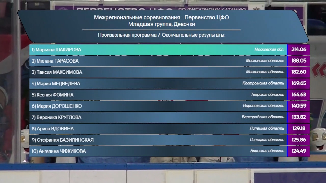 Анна Алексеевна РЯБОВА Рязанская обл., ГАУ РО "ХК "Рязань-ВДВ" 1z!?2a2t 3f на зубчик, fall 3r в твизл 2a3tq? fccosp2V 3z<< на 2 ноги, fall (в том же углу что и Самичева) 3r2t 3s ? chsq1 пвш 50.99