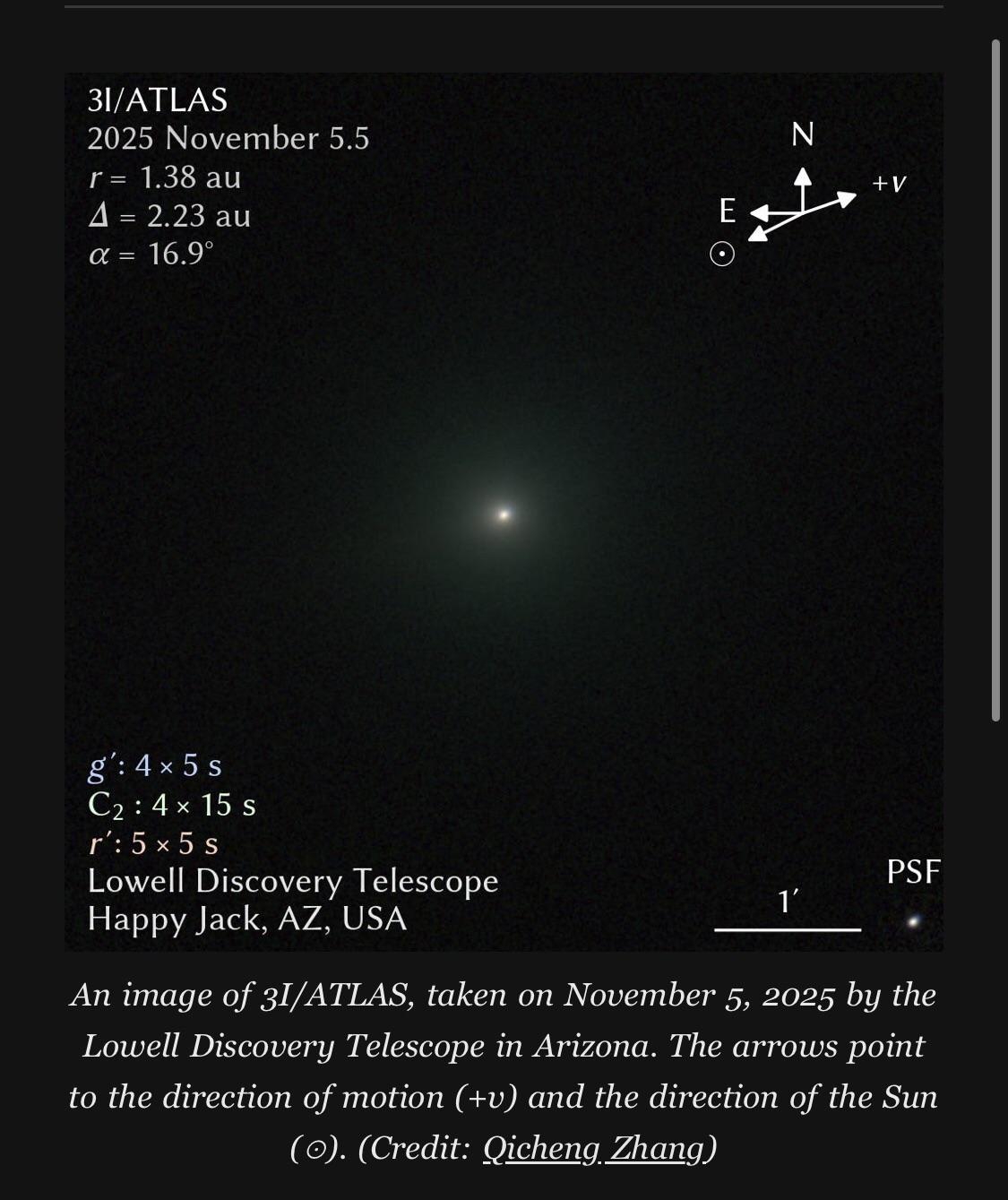 Облучённая комета 3I/ATLAS светится зелёным и скрывает свой хвост на новом изображении Чжан отметил, что если внимательно присмотреться, левая сторона кометы выглядит немного ярче, чем правая. Это слабое асимметричное свечение возникает потому, что мы видим хвост почти фронтально, и он находится прямо позади кометы, слегка изгибаясь влево. https://www.livescience.com/space/comets/irradiated-comet-3i-atlas-glows-green-and-hides-its-tail-in-new-image