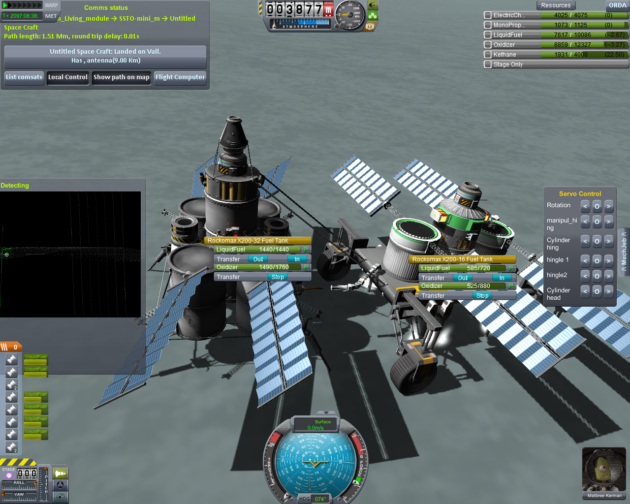 Тем временем, разворачиваем строительство орбитальной станции. Подымаем базовый модуль: двигательная установка, командный отсек, базовый жилой отсек, небольшой склад припасов, разветвитель. Всё вместе 17 тонн. Подымаем на орбиту 350км. Засылаем туда первых огурцов на простеньком кораблике. Подымаем и стыкуем второй модуль, причал для кораблей. Красивая панорамная кабина, многосторонний узел стыковки, шлюз для выхода в открытый космос. Третий модуль будет жилой-складской, но под него пока большие обитаемые кабины не открыты. Четвертый модуль - научный, уже спроектирован в редакторе, но хотелось бы тоже открыть в ветке исследований ещё пару экспериментальных девайсов.