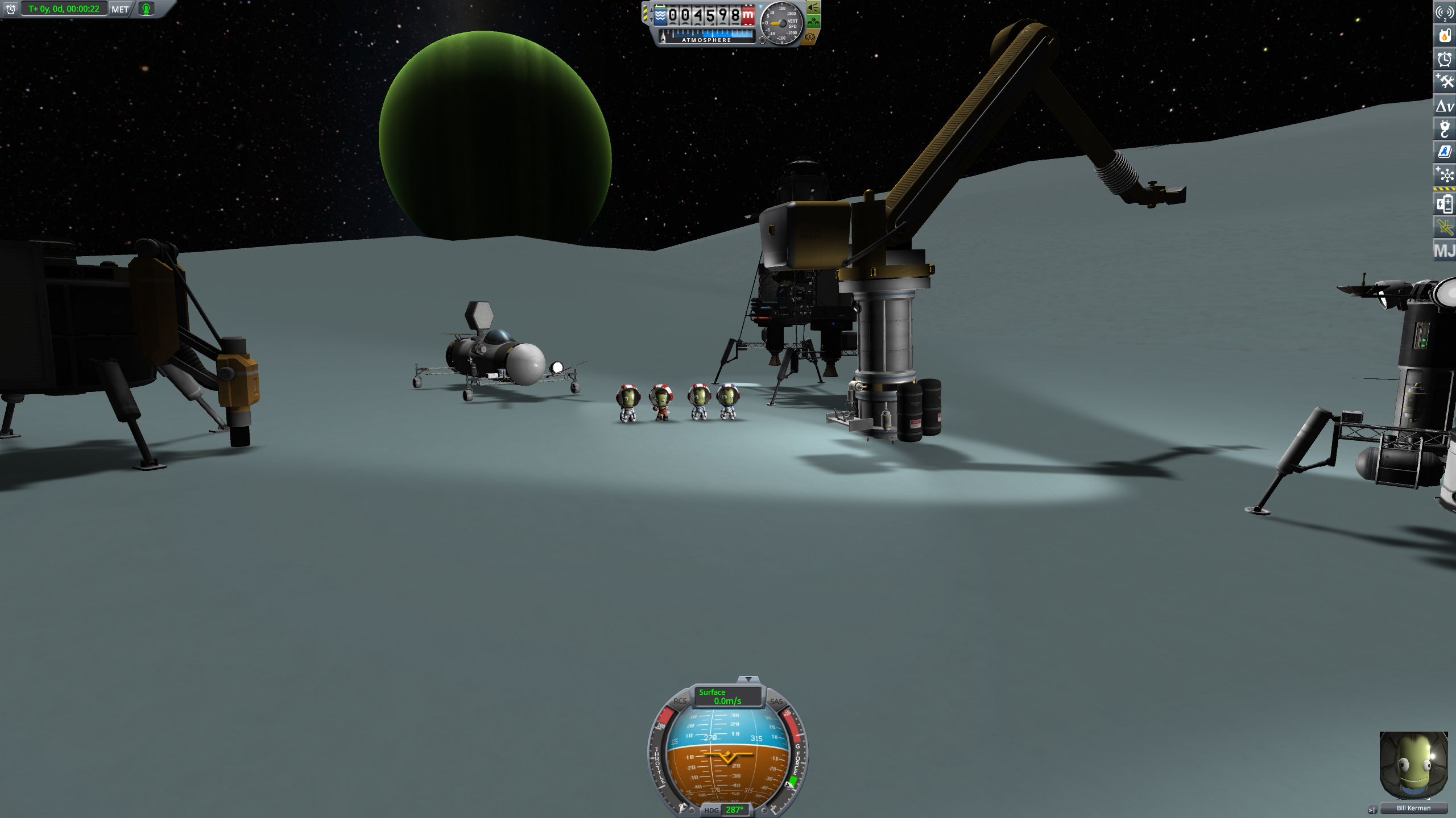 >Ну и до сих пор не разобрался как еду выращивать, или как это происходит. Цикл - 200 дней. Нужна теплица, электричество, углекислый газ и аммиак. Одна теплица даст еды примерно на 1го кербала. Без любого ресурса (кислород, Вода, еда) кербал живёт ещё неделю. Правда в обморок падает.