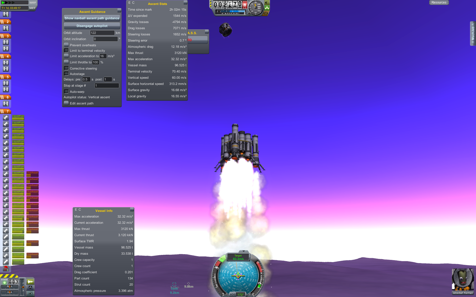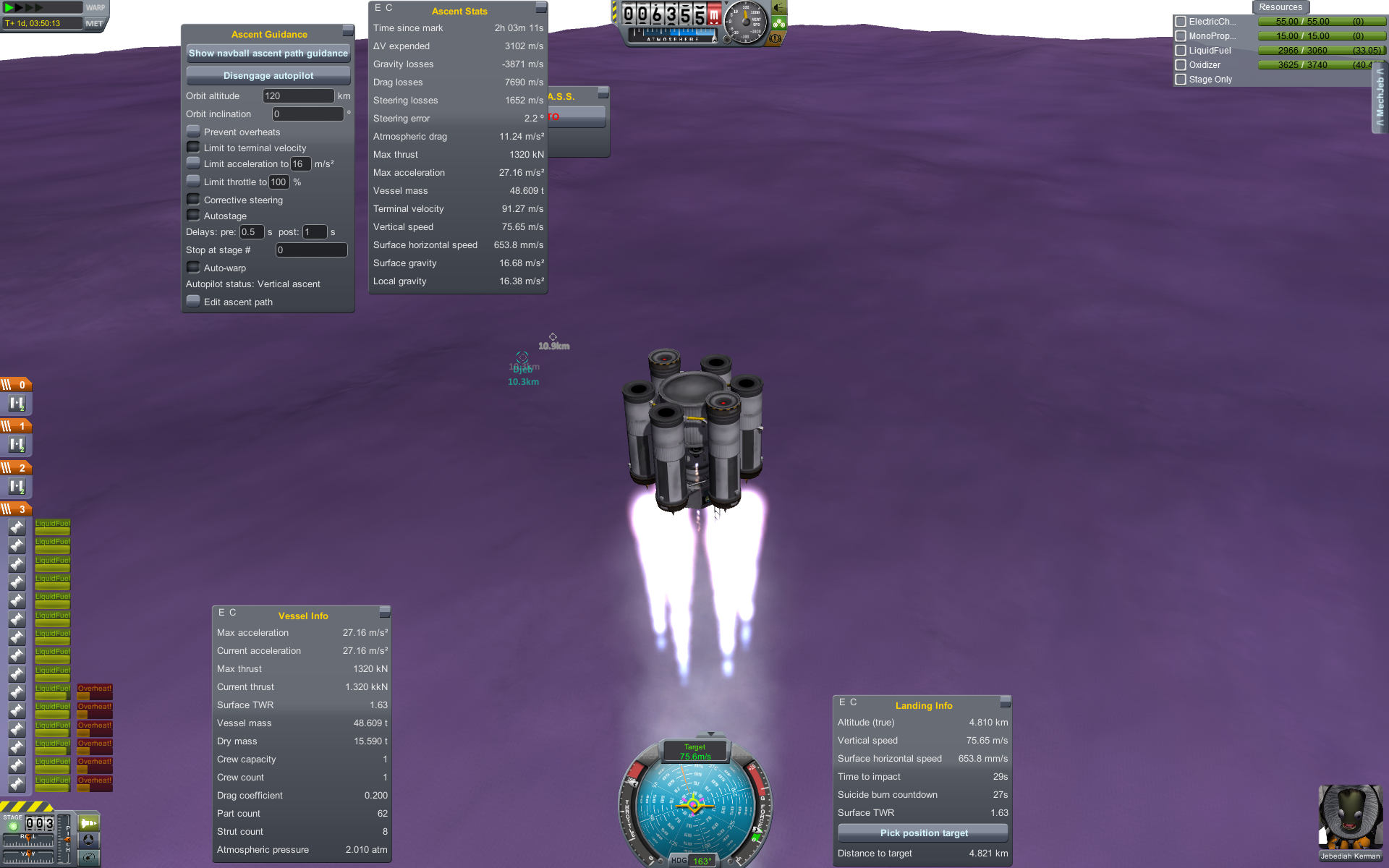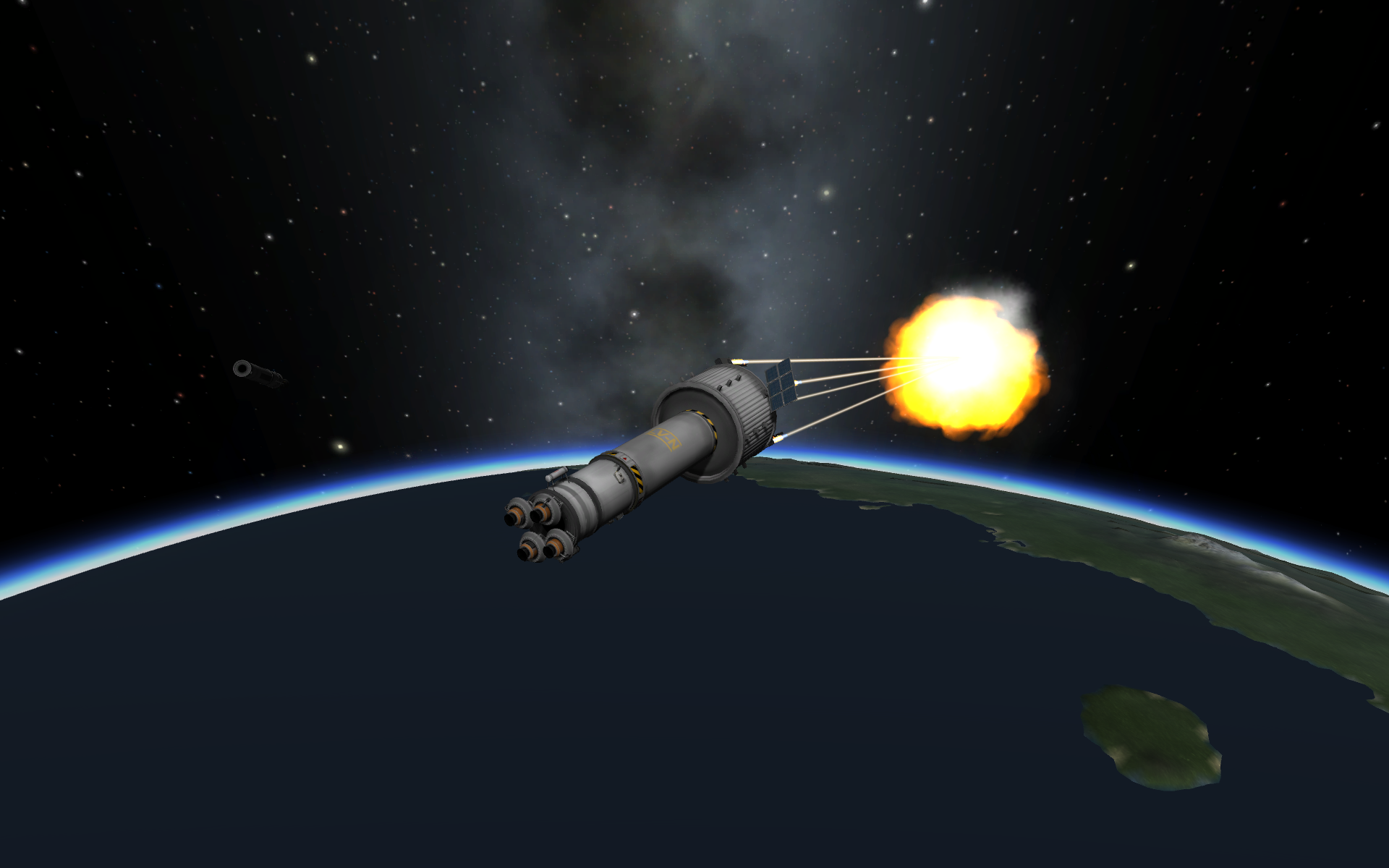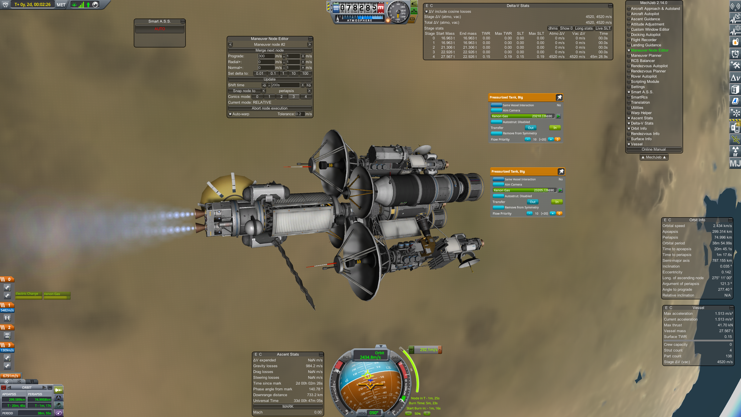 Дальше готовим разгонный маневр и постигаем искусство летать с удельной тягой 0.07. Маневр на 3500 м/с требует 70 минут прожига, что сравнимо с орбитальным периодом в 100 минут. Что же делать? Выход известен - разгоняемся за несколько витков. Можно это делать руками, а можно взять мод Node Splitter, который автоматически распилит маневр на витки с разбивкой либо по дельте в, либо по времени прожига, либо по высоте апоцентра или ещё как-то. Разбиваем на 5 прожигов по 10 минут и остаток. Между прожигами корректируем точку очередного маневра через Мехджеб -> Snap node to periapsis. Успешно разогнались, выкидываем пустые боковые баки. Интересная деталь - маленькие сопла для прогона рабочего тела тоже пукают.