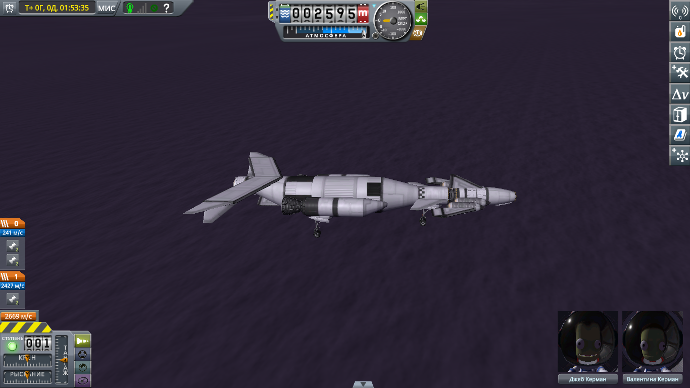 >>816804 Накидал по памяти двухступенчатый крафт. Ебаться пришлось не с дельтой и не с разделением-переключением, а с тем, что евовская гравитация ломает шасси, верхние слои атмосферы больно жгут при входе, а в нижних самолет бесоебит. Вторую ступень лучше заправлять на орбите, гасить 3 км/с об атмосферу мне не понравилось. За ССТО и пропеллерами на ютуб, задроты давно это осилили.