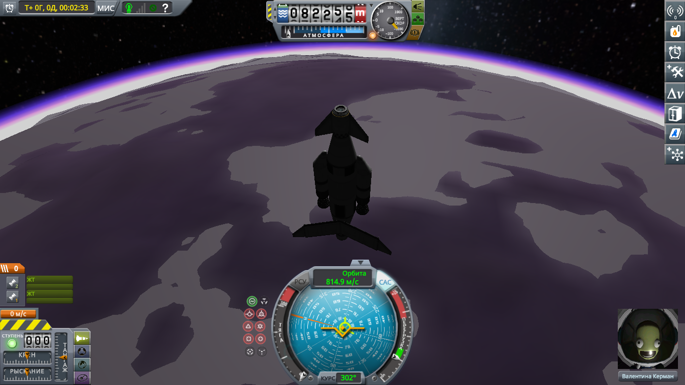 Первые шаги: как попасть на орбиту родной планеты Гейл (Gael). Атмосфера кончается на 125км, опорная орбита пусть будет 155км. Если летать ниже, то плонета криво рисуется. Первая космическая 7800 м/с, значит, носителю нужно около 9500 м/с дельты-в. Строим маленький двухтонный корабль и двухступенчатую ракету УР-200. Отметим, что космодром тут не на экваторе, а примерно на 8.6 градусов с.ш. Баллистическое торможение с 7.2 км/с это вам не барбисайз, опасно даже без всяких дедли реентри. Попробовал пару раз порулить руками, понял, что при малейшем перекосе капсулу пидорасит, ладно, есть САС.