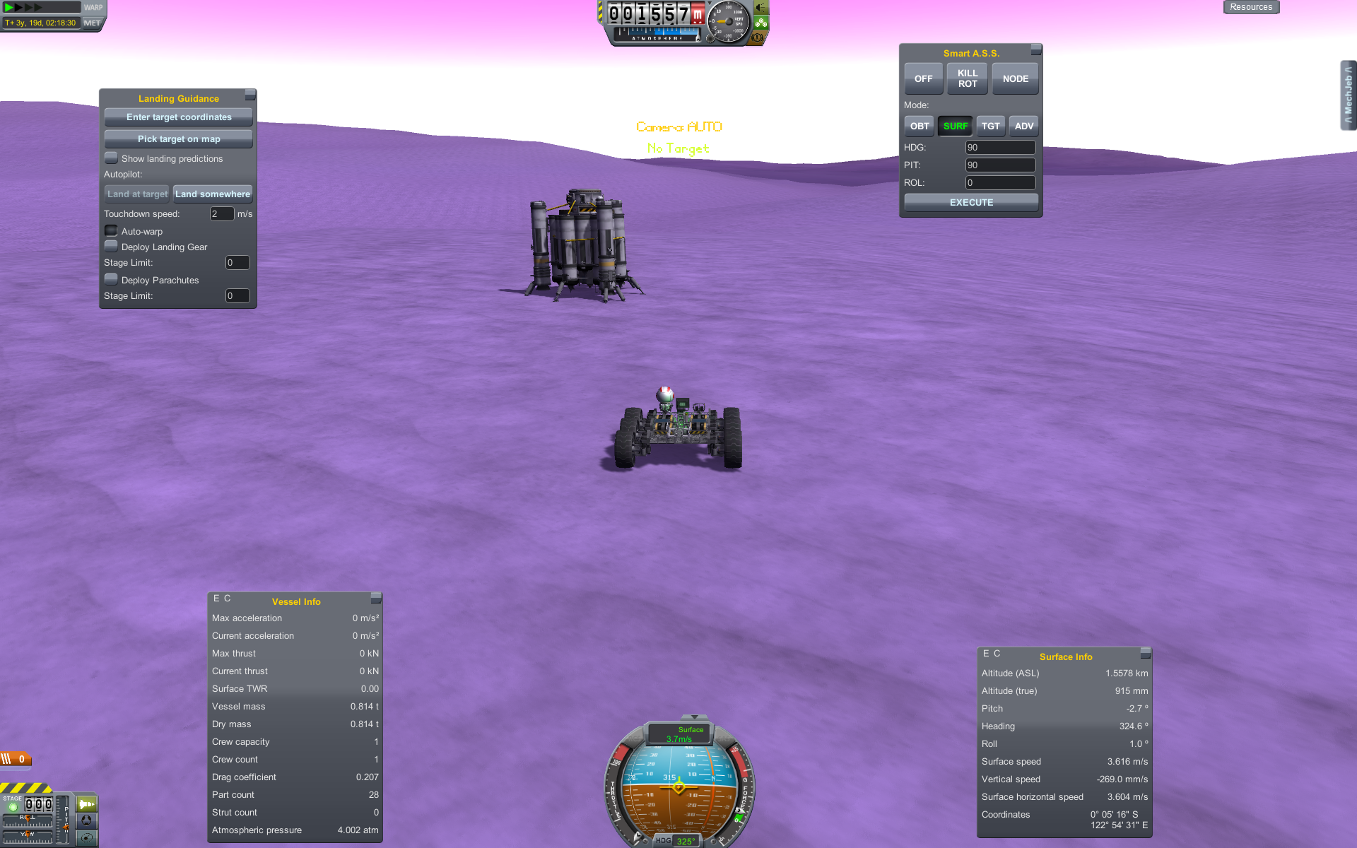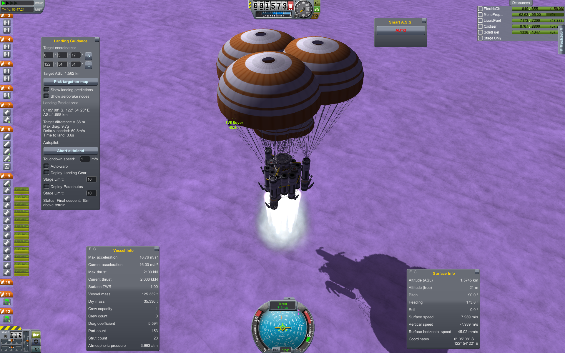 >>789037 Входим в атмосферу. Она высоченная, 160 км, но достаточно разреженная, 0.1 атмосфер у поверхности. Тормозимся надувным щитом, выпускаем парашюты (в RealChute всё ещё не решена проблема пересечения разных парашютов одного крафта, хотя вроде сделать это не так сложно), откидываем щит, показываем раскладную коляску, висящую внутри. Вблизи поверхности скорость спуска около 15 м/с, что всё ещё многовато. За 80 метров до земли запускаем посадочные твердотопливные петарды, которые замедляют скорость до комфортных 5 м/с. Ура, мягкая посадка.