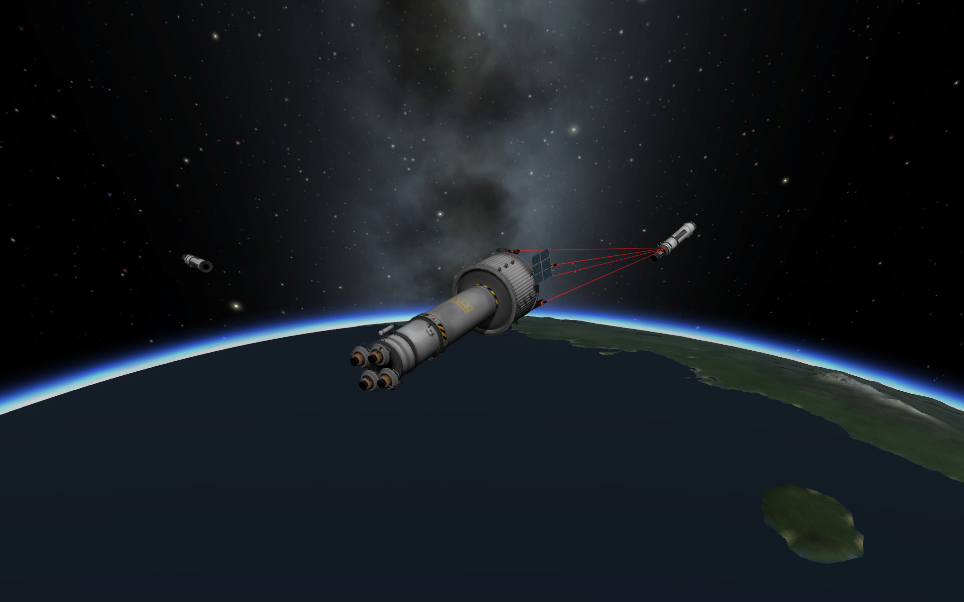 Вторые шаги: лепим четыре УР-200 вместе, добавляем ещё верхнюю одну ступень от неё же и получаем носитель УР-400 на 8 т. В этот бюджет уже можно упихать мини-станцию с кучей научного оборудования и жилым отсеком. Запускаем на полярную орбиту, включаем сканеры, разглядываем родную планету. Когда приходит время возвращаться домой, замечаем, что для полярной орбиты вращение планеты уже не роляет, так что тормозим с честной первой космической. Здеся уже даже САС не хватает, надо дополнять ручным вращением.