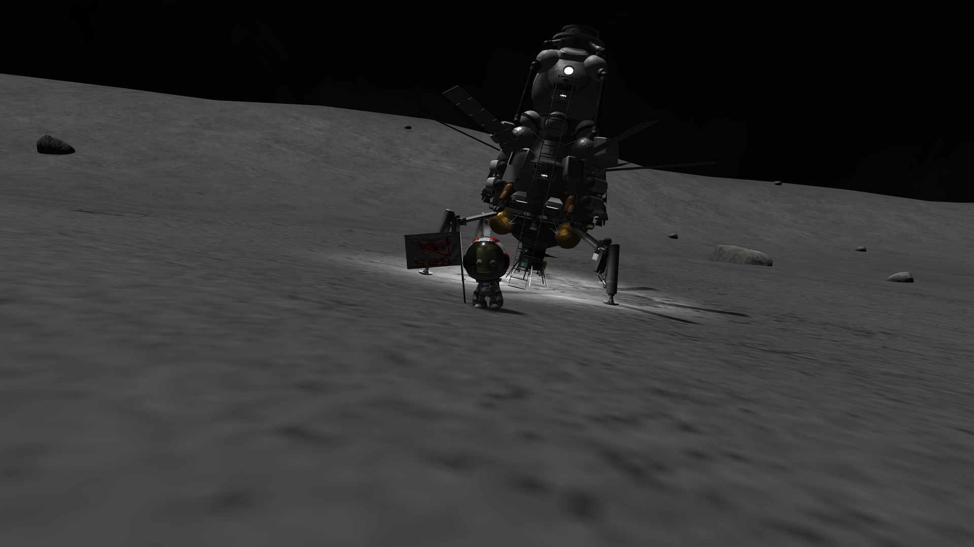 Отцепляем и раскладываем коляску, вылезаем из корабля, втыкаем флаг и фоткаемся. Потом пытаемся залезть обратно в корабль и матюгаемся на нестыкующиеся лестницы. Сука, опять забыл проверить перед полётом. Ну ладно, кое-как допрыгать можно. Возвращаемся на поверхность.