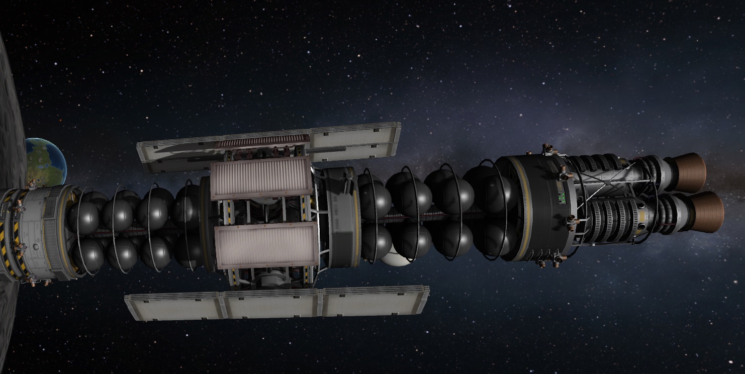 Компонуем межплонетный корабль на 4 рыла. Сверху вниз: служебный отсек возвращаемой капсулы, сама капсула с теплощитом, инструментальный отсек, командный отсек, научно-лабораторный, жилой (с топливными баками коррекционных двигателй в стенках для защиты от солнечных вспышек, см. Storm Cellar). Дальше грузовой отсек с двухместным посадочным кораблём, бак с водородом, ну и силовая установка: маршевый ядерный дрыгатель, два маломощных жидкотопливных для коррекций, два малых реактора и набор радиаторов для охлаждения. Итого получилось 200 тонн. Выводим всё это на орбиту свеженькой 250-тонной ракетой, потом выводим и цепляем боковые баки, две штуки по 120 тонн.