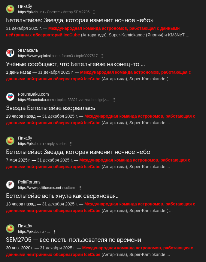 31 декабря 2025 г. — Международная команда астрономов, работающая с данными нейтринных обсерваторий IceCube (Антарктида), Super-Kamiokande (Япония) и KM3NeT (Средиземное море), объявила о регистрации мощного потока нейтрино высокой энергии, характерного для коллапса ядра массивной звезды. Анализ траекторий и энергетического спектра частиц позволил однозначно идентифицировать источник: красный сверхгигант Бетельгейзе ( Ориона), расположенный на расстоянии около 650 световых лет от Земли.